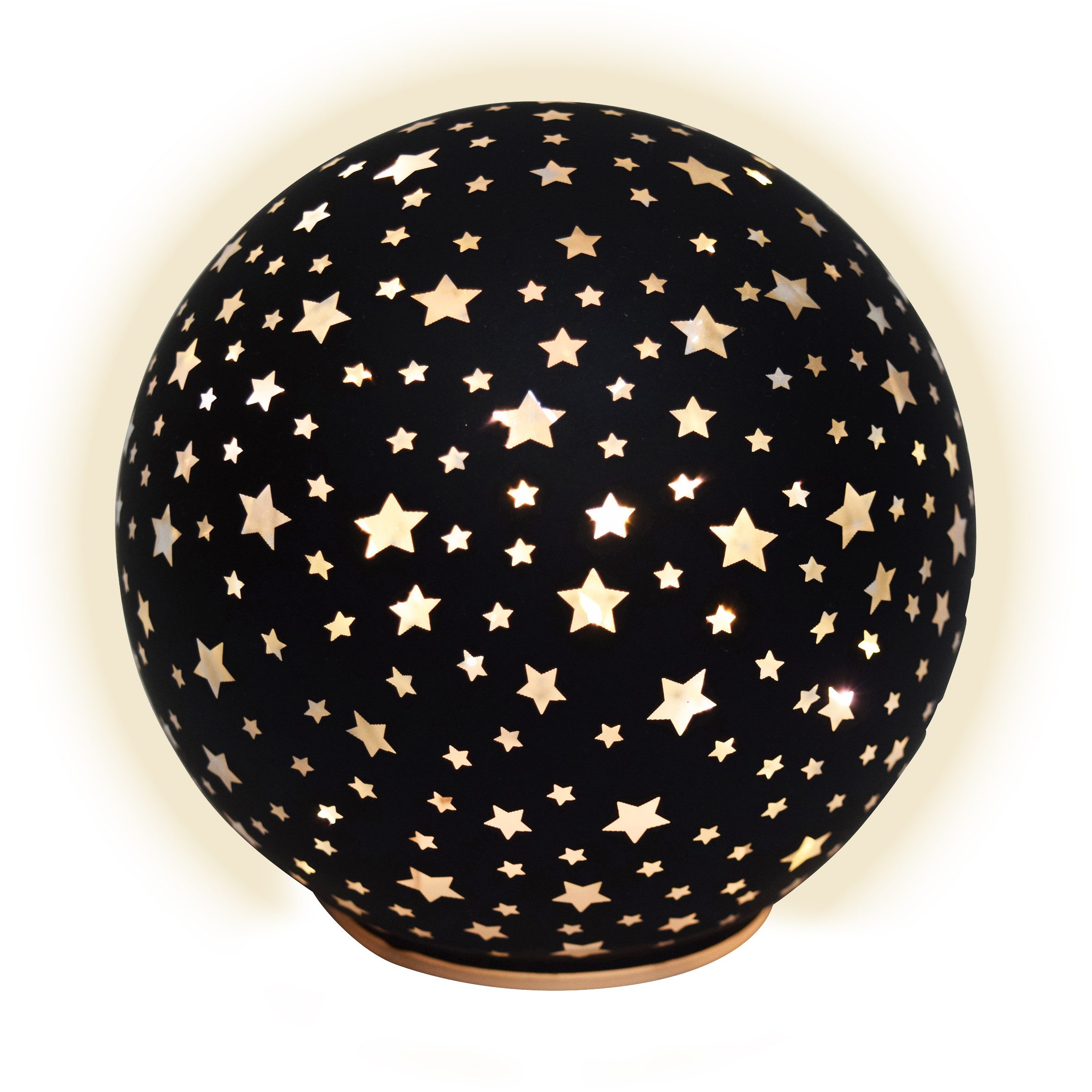 Kunstvolle Glaskugel zum Hinstellen in elegantem schwarz matt mit Sternen verziert und mit LED Lichterkette in warm weiß beleuchtet