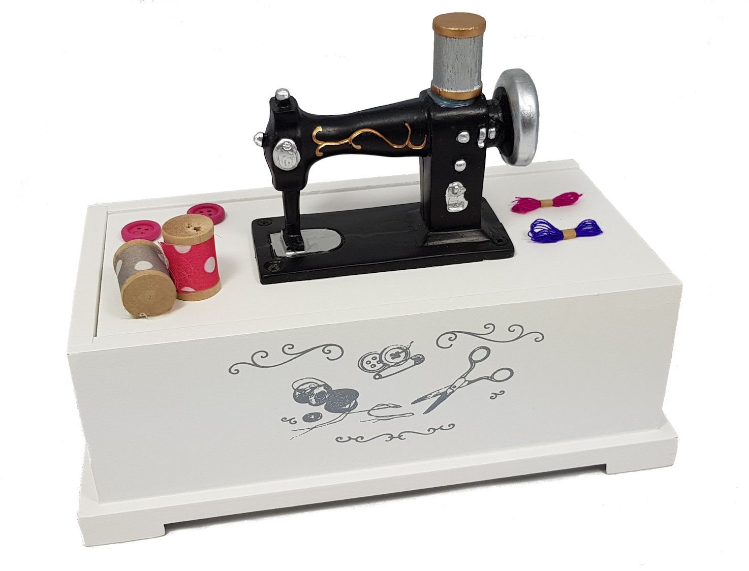 Dekoratives Nähkästchen mit kleiner Nähmaschine auf dem Deckel in weiß ca. 22 cm