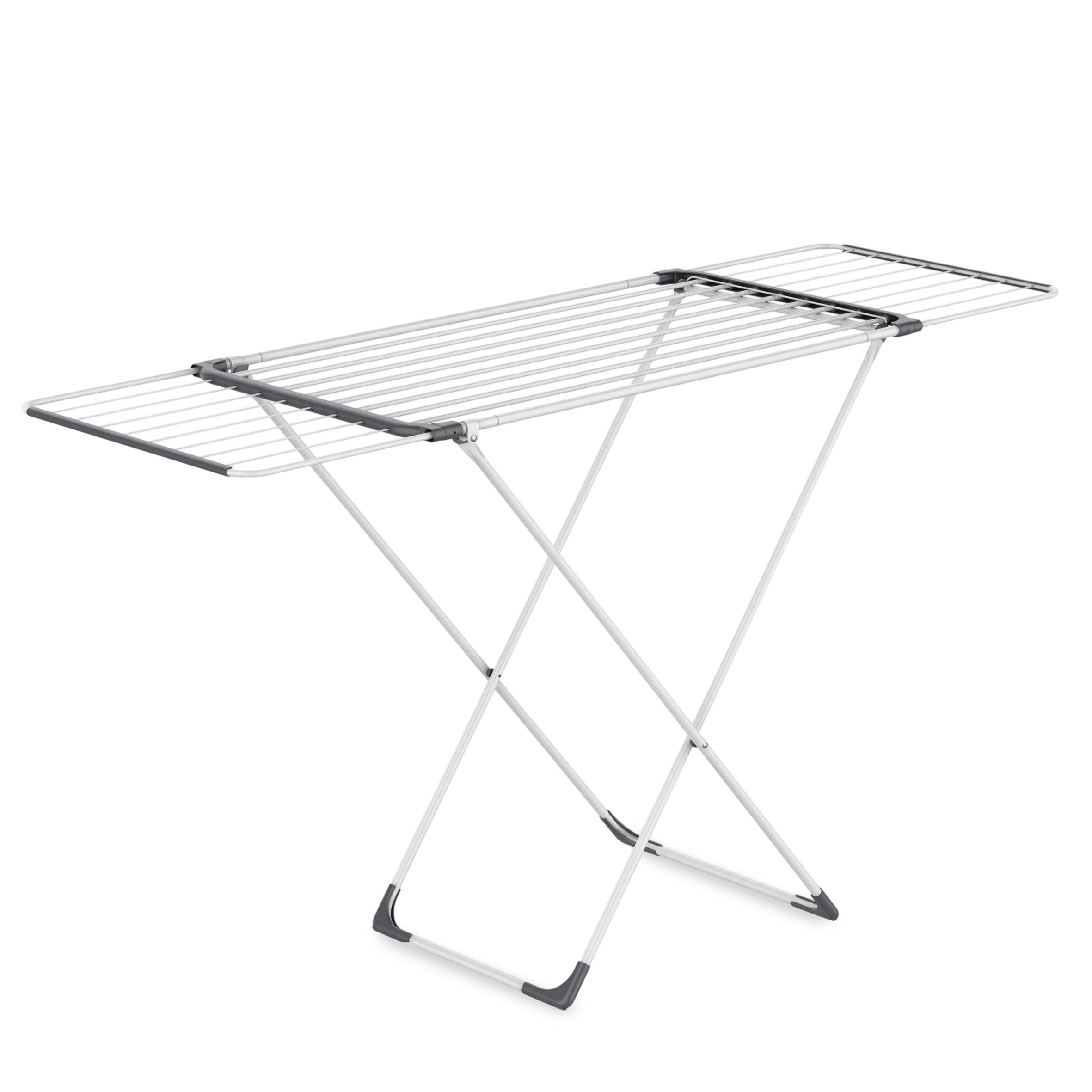 Wäschetrockner aus Metall in weiß mit ca. 18 m Trockenlänge mit ausziehbaren Flügeln von 108 cm auf 178 cm Gesamtlänge