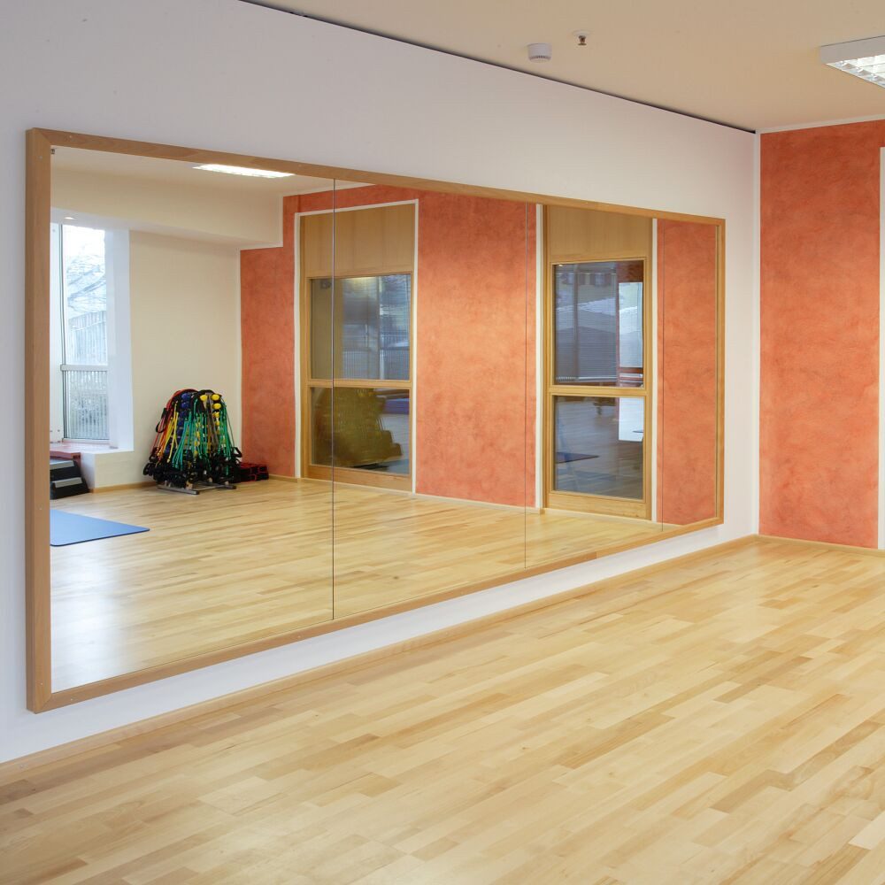 Der Sicherheitsspiegel "Kristall" ist speziell für Sportstätten entwickelt. Die Spiegelpaneelen bestehen aus einem 6 mm starken Kristallglasspiegel, aufkaschiert auf einer extrem leichten Kunststoffplatte mit -Rücken. Die 27 mm starken Verbundpaneelen dienen der Sicherheit und machen den Sicherheitsspiegel "Kristall" stoß- und bruchfest. Durch die stabilen Montageleisten werden Unebenheiten der Wände einfach ausgeglichen. Gleichzeitig sorgen sie im Zusammenspiel mit den Verbundpaneelen für ein verzerrungsfreies Spiegelbild.