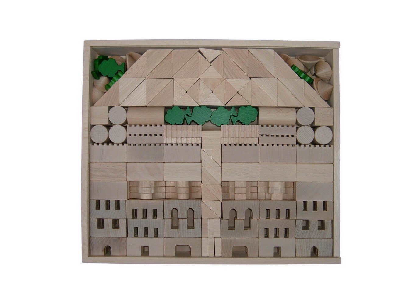 Bausteine und Bauklötze sind eines der ältesten Spielzeuge für Kinder. Der Baukasten Architektur bietet mit 345 Holzbausteinen viele Möglichkeiten zur Konstruktion und Gestaltung. Das Spiel mit den Bausteinen fördert im Bewegungsbereich die Grobmotorik und Feinmotorik. Der Archiketur Baukasten besteht aus einer praktischen Holzbox.