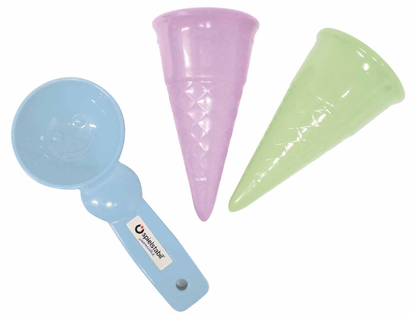 Die Eistüten haben einen Durchmesser von ca. 6 cm, der Eisportionierer ist 15 cm groß, und alle Setteile sind aus hochwertigem, stabilem Kunststoff gefertigt.