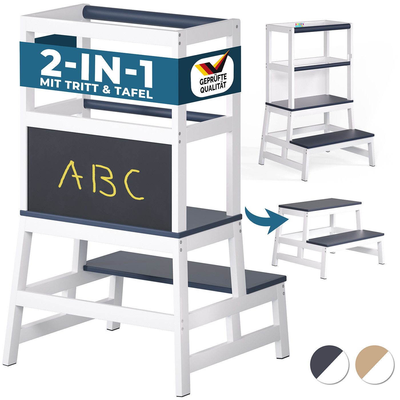 Ein cleveres Gimmick für Eltern: Praktische Schutzpads, die an der Vorderseite des Lernturms angebracht werden können, schützen die Anstellfläche vor Kratzern. Wenn das Kind größer geworden ist, kann der obere Teil abgenommen und der untere Teil weiter als Trittschemel genutzt werden, der wegen seiner Belastbarkeit bis 100 kg auch für Erwachsene geeignet ist.