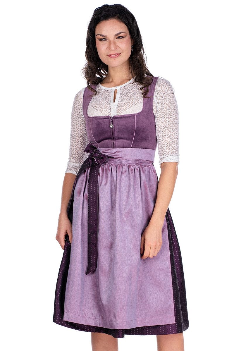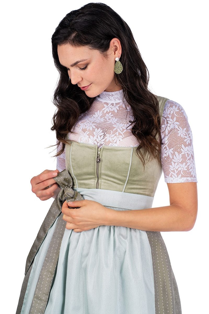 Dieses entzückende Samt Dirndl "Doreen" in kniebedeckender Midi-Длина ist ein grandioses Schmankerl in harmonischen Grün-Tönen. Das tailliert geschnittene Mieder besteht aus herrlich changierendem Samt in feinem Pistaziengrün, der je nach Lichteinfall heller oder dunkler wirkt, hat einen Balconette-Ausschnitt, vorn einen verdeckten Reißverschluss mit einem niedlichen Blüten-Anhänger in Altsilber mit Glitzerstein als Zipper. Sowohl der Ausschnitt als auch die Teilungsnähte vorn sind mit Schürzenstoff, die Armausschnitte sowie Teilungsnähte hinten mit Samt abgepaspelt. Der traumhafte, knapp wadenlange Rock ist aus fein glänzendem Jacquard in Helloliv gefertigt, hat ein feines Webmuster aus lieblichen Ranken auf einem rustikal angehauchten Untergrund, ist in breite Kellerfalten gelegt und rechts mit einer Reißverschlusstasche versehen. Das doppellagige Schürzenbindeband aus Rock- und Schürzenstoff hält die Schürze in fein schimmernder Wildseiden-Optik in zartem Mintgrün, die am Bund liebevoll gehanselt ist und einen geraden Saum besitzt. Im Lieferumfang ist das Midi Dirndl mit der Schürze enthalten, eine Bluse ist nicht inbegriffen. Beachten Sie bei Размер 48 bitte den Größenzuschlag.