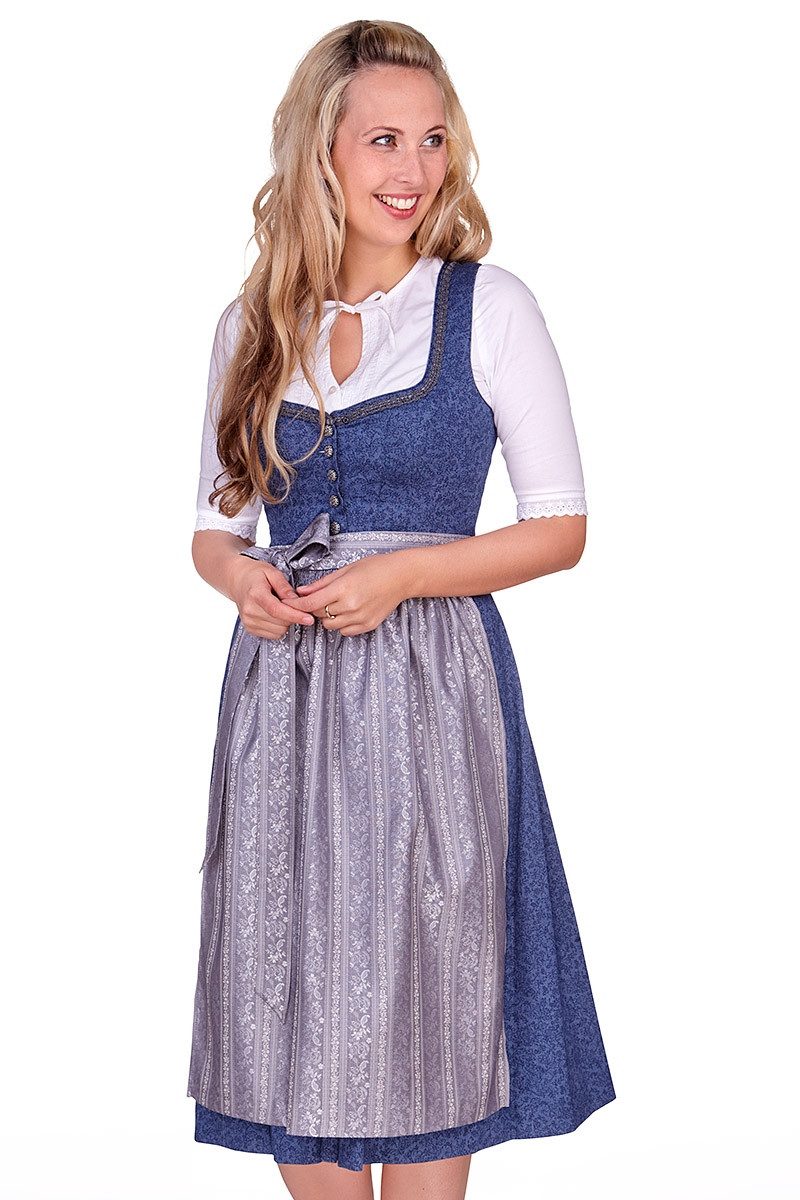 Das schmeichelhafte Midi Dirndl Wein in Denim/Silber aus dem Hause Spieth & Wensky besteht aus reiner, angenehmer Baumwolle und hat ein feines Printmuster im Jeans-Look mit zarten Blumenranken in Dunkelblau. Der stilvolle, leicht herzförmige Ausschnitt wird von einer schmucken Posamentenborte in Kombination mit einer Samtborte umrahmt. Sowohl der Ausschnitt als auch die Armausschnitte am taillierten, sauber abgefütterten Mieder sind abgepaspelt. Traumschöne, silberglänzende Kugelknöpfe im filigranen, floralen Ajour-Design schmücken die Knopfleiste. Der wundervolle, schön fließende Rock ist in schmale Kellerfalten gelegt und hat links seine Eingrifftasche mit Reißverschluss. Die am Bund gehanselte Schürze und das schöne Schürzenbindeband im bezaubernd schimmernden Jacquard-Stil haben einen eleganten Streifen-Look aus zweierlei Blumenranken, feinen Linien und Pünktchen. Je nach Lichteinfall wirken die Motive dunkler oder heller. Das hinreißende Baumwoll-Midi Dirndl wird inklusive der Schürze geliefert, eine Dirndlbluse ist nicht inbegriffen. Bitte beachten Sie die Größenzuschläge ab Размер 48.