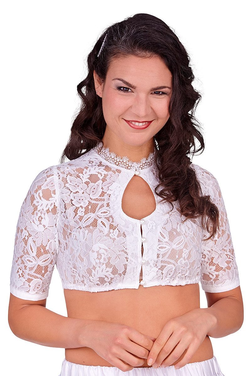 Diese verführerische Dirndlbluse Wachsflower aus dem Hause Spieth & Wensky wird aus wundervoller, floraler Spitze mit hohem Baumwoll-Anteil gefertigt, hat halblange Ärmel und einen raffinierten Ausschnitt. Die großen Blüten- und Ornamentik-Motive auf der semi-durchsichtigen, dezent elastischen Spitze sind teils leicht erhaben und teils edel glänzend. Der zarte Rundhals-Stehkragen aus liebreizender, wellenförmig abschließender Spitze hat vorn einen Knopf und eine elastische Knopfschlaufe als Verschluss und darunter befindet sich ein sexy Ausschnitt in Tropfenform. Geschlossen wird die bezaubernde Dirndlbluse durch hübsche Knöpfe mit Perlmutt-Schimmer und elastischen Knopfschlaufen. Die Bündchen der stilvollen Spitzenärmel sind mit Blusenstoff umsäumt, geschlitzt und jeweils mit einem Knopf sowie einer Knopfschlaufe versehen. Der elastische Saum sorgt für den richtigen Sitz. Bitte beachten Sie ab Размер 48 den Größenzuschlag.