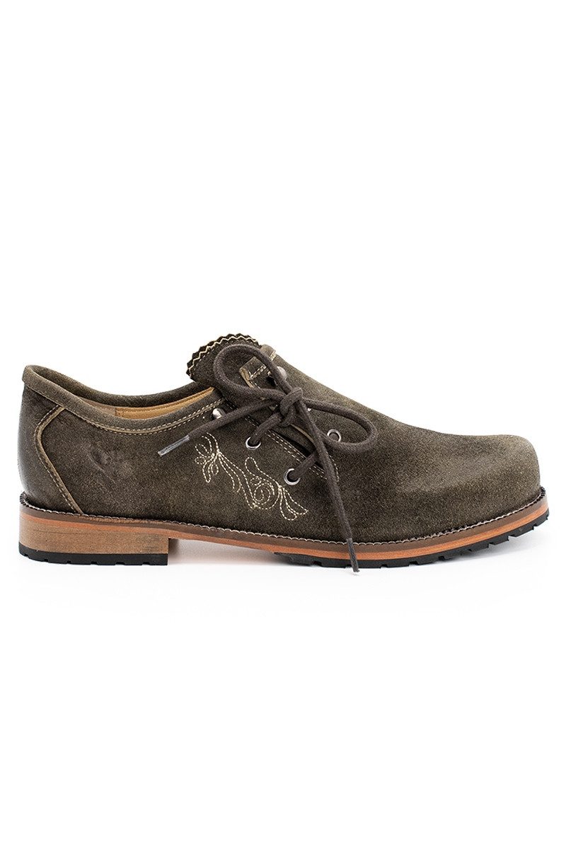 Wiko, die stilvollen Haferlschuhe für Herren von der Marke Spieth & Wensky, werden aus samtigem, partell gespecktem Wildbock-Veloursleder gefertigt und haben die traditonelle Seitenschnürung. Der Einstieg ist leicht kontrastfarben umsäumt, die Spitze abgerundet und die Hinterkappe verstärkt sowie leicht hochgezogen. Die geflochtenen Rundkordel-Schnürsenkel werden über ein Paar Haken und zwei Paar Ösen gefädelt. Ein weiteres Paar Schnürsenkel in Hellbraun liegt bei. Gegen Nässe und Schmutz gibt es eine weiche Staublasche mit Zickzack-Kante. Unterhalb der Schnürung zieren schöne, florale Ornamentik-Stickereien in Kontrastfarbe die urig-eleganten Trachtenschuhe. Der Übergang vom Obermaterial zur Sohle ist mit einer Wellenkante mit Kontrastnaht betont. Die zweifarbig geschichtete Zwischensohle aus Leder mit dem Absatz in Holz-Optik und der grob profilierten Gummisohle machen die zünftigen, hochwertigen Herrenschuhe perfekt. Für einen bequemen Tragekomfort sorgt das Lederfußbett. Bitte beachten Sie die Größenzuschläge ab Размер 47.