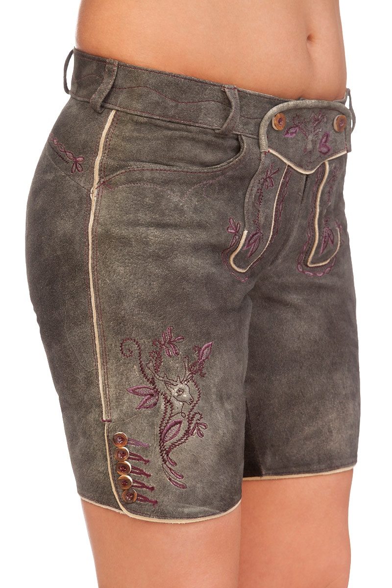 Die stylische, kurze Lederhose Maike für Damen im feschen, märchenhaften Design aus dem Hause Spieth & Wensky sorgt für zünftig-romantisches Trachtenglück. Sie besteht aus superweichem Ziegenveloursleder antik und hat einen angedeuteten Latz. Der obere Teil des Trachtenlatzes ist mit Zierknöpfen bestückt und wird linksseitig eingehakt. Unter dem oberen Latz-Teil befindet sich ein Knopf und der Reißverschluss darunter ist ebenfalls verdeckt. Kontrastfarbene Keder sowie wildromantische, farbige Hohlstickereien sowie Stickereien zieren den Latz. Traumhafte Hohl- und Stickereien sind auch an den Beinen sowie auf der Rückseite quer über der Tellernaht zu finden. Die Stickereien haben die Form von Blättern, Ranken und Zierlinien und sind mit burgunder- und mauve-farbenem Garn gearbeitet. Sowohl die Hirschköpfe und die Geweihe sind als Hohlstickereien mit Kontrastgarn-Kontur hervorgehoben. Die seitlichen Beinnähte sind mit einem Kederleder unterlegt. Der Beinabschluss mit Keder wird seitlich mit echten Beinknöpfen geknöpft. Die Knöpfe haben eine Hirschhorn-Optik und sind mittig farbig lackiert. Für die Knopflöcher an den Beinen wird ein Kontrastgarn verwendet. Vorn verfügt die klassische Damen Lederhose über zwei Eingrifftaschen, die mit einer Ziernaht verfeinert sind. Der Bund hat ebenfalls eine zarte Ziernaht sowie Gürtelschlaufen. Für den richtigen Sitz sorgt der Zwickel mit Schnürung hinten am Bund und für einen tollen Tragekomfort das angenehme Innenfutter.