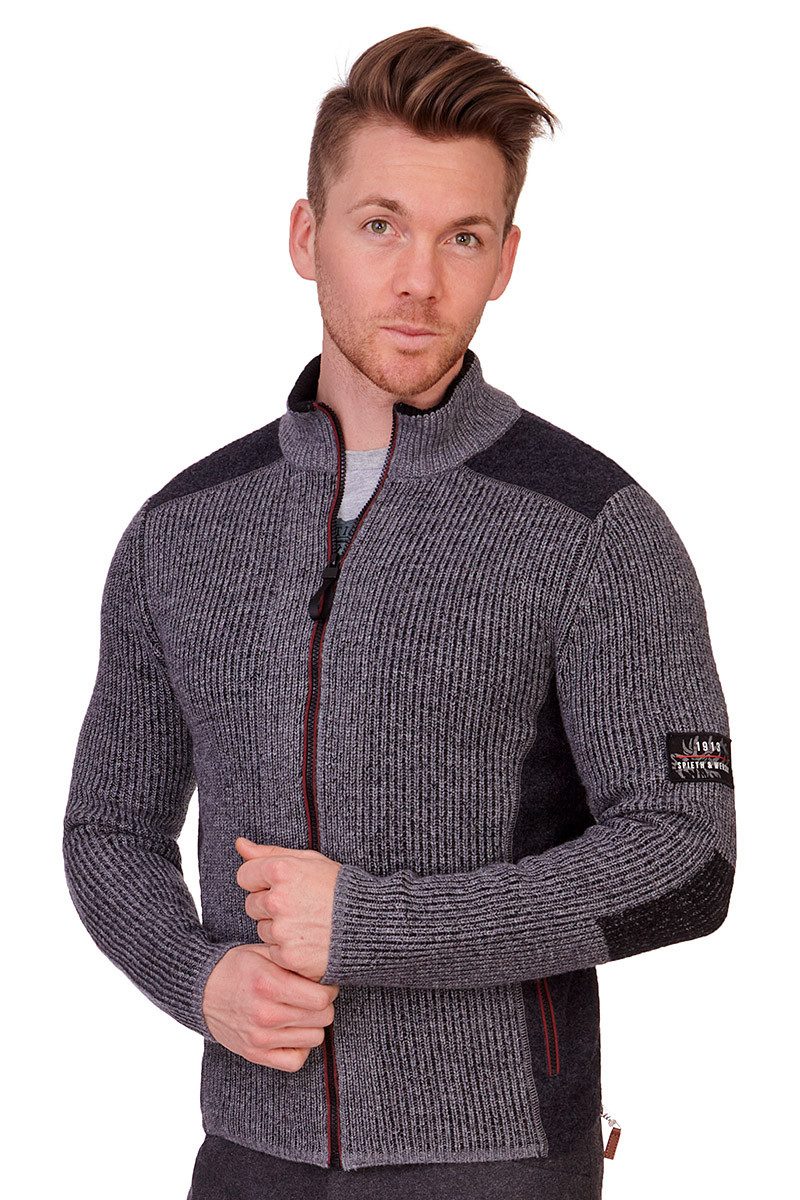 Diese modisch-sportliche Herren Strickjacke namens Steinerberg mit weichem Woll-Anteil in der Farbkombination Taupe/Anthrazit stammt aus dem Hause Spieth & Wensky und lässt sich toll zu Lederhose und Trachtenjeans kombinieren. Sowohl die Vorder- und Rückseite als auch die Ärmel und der Stehkragen haben ein trendy Rippenstrick-Muster im feinen Zopf-Stil; die Schultern und die Seiten sind aus kontrastfarbenem Walk-Material gefertigt. Der Kragen ist innen mit kontrastfarbenem Rippenstrick-Material verstärkt, das außen als Kontrastkante sichtbar ist. Vorn gibt es einen Reißverschluss mit einer Ripsband-Schlaufe am Zipper und auch die beiden Eingrifftaschen verfügen über einen Reißverschluss mit Stoffanhänger; zudem sind die Reißverschlüsse allesamt beidseitig kontrastfarben in Eisgrau abgepaspelt. Die Ärmel haben rechteckige Ellenbogen-Partien in Kontrastfarbe und der linke Ärmel oben einen Aufnäher mit Jahreszahl, Markenname und Geweih-Motiv. Den Nackenbereich schmückt ein raffiniertes Rippenstrick-Muster in V-Form sowie eine kleine Stoffschlaufe unter dem Kragen. Die hervorragende Herren Strickjacke mit Walk-Partien ist durch ihren stylisch interpretierten Trachten-Look der perfekte Begleiter für Fashion-Hungrige.