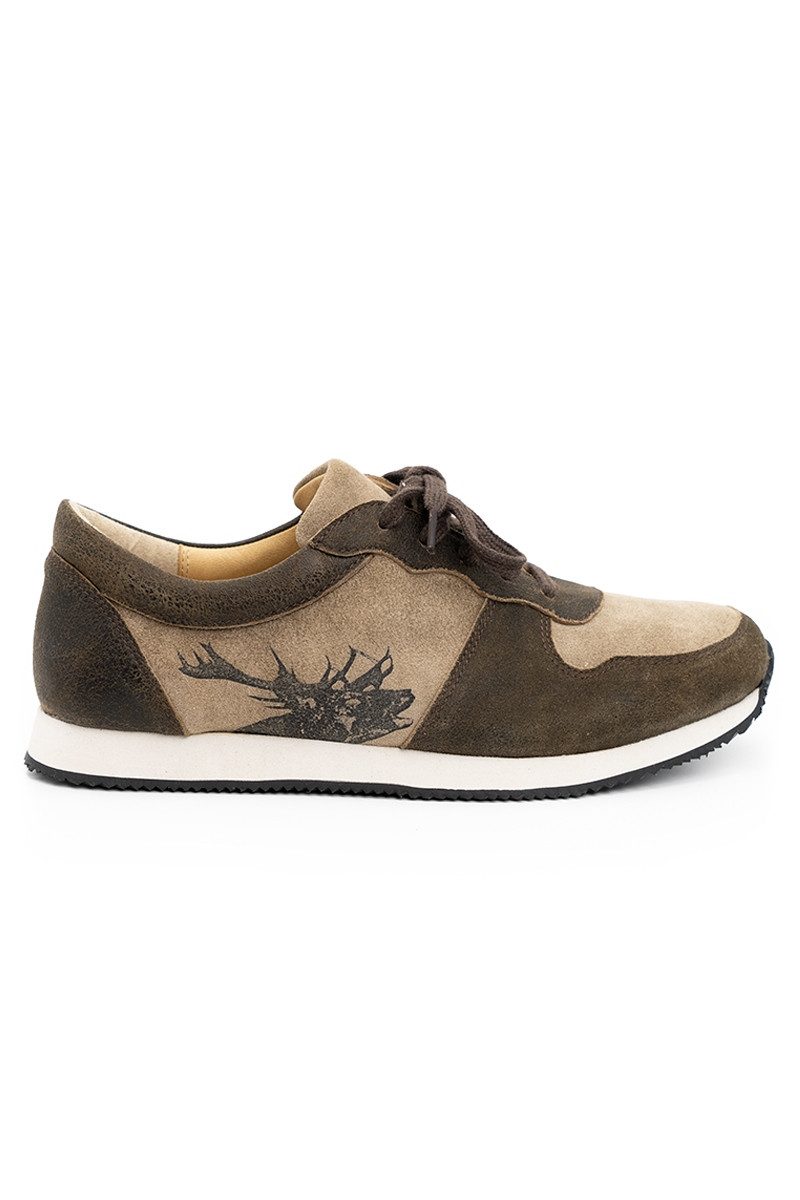 Walter, die kernig-sportiven Herren Sneaker in Ruß/Whisky aus dem Hause Spieth & Wenksy, werden aus feinem Leder in modischer Farb-Kombination in hochwertiger Qualität hergstellt. Der gepolsterte Einstieg, das schicke Ösenleder mit der Wellenkante, die leicht hochgezogene Hinterkappe und der Vorderkappen-Rahmen sind aus leicht samtig strukturiertem, dezent glänzendem Nappa Crash-Leder in Ruß gefertigt, die Seiten, die Vorderkappe oben und die leicht gepolsterte Zunge oben aus samtigem Wildbock-Veloursleder in Whisky. Die Außenseiten schmückt ein fantastischer Print eines röhrenden Hirschs. Für die Schnürung sind geflochtene Flachsenkel in Dunkelbraun vorgesehen - ein weiteres Paar Schnürsenkel in Beige liegt bei. Für einen angenehmen Tragekomfort sorgt das gepolsterte Lederfußbett. Die kontrastfarbene, leichte Zwischensohle im Hartschaum-Stil ist mit einer rutschhemmenden Laufsohle mit raffiniertem Zickzack-Profil in Schwarz kombiniert. Bitte beachten Sie die Größenzuschläge ab Размер 47.