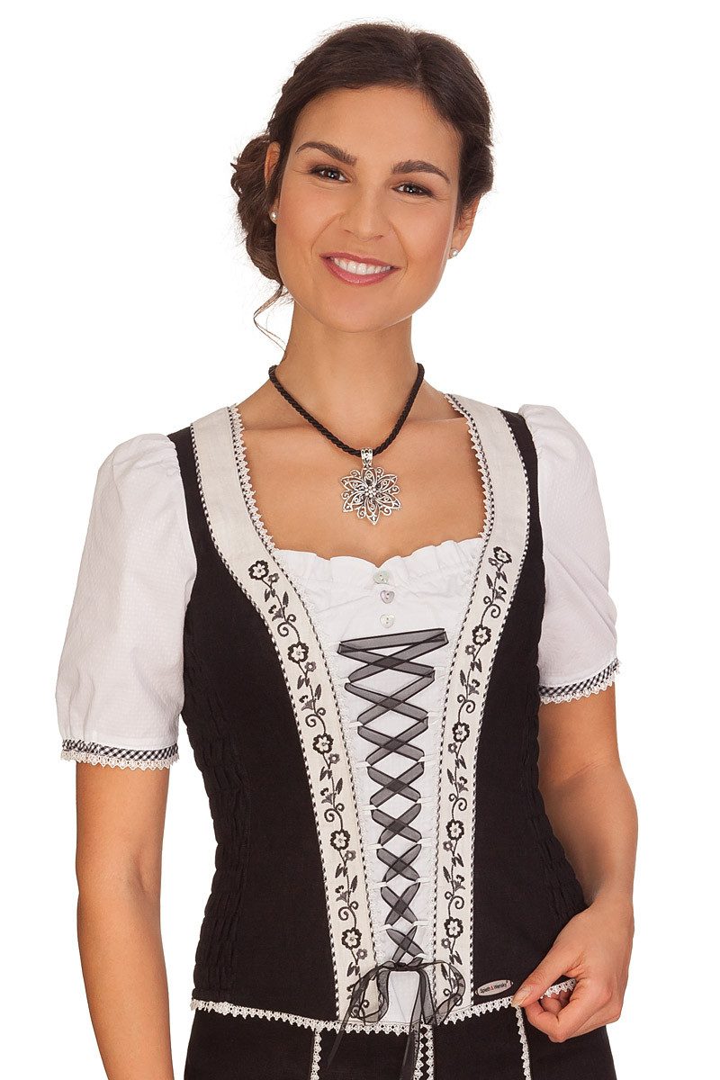 Das bezaubernde, tailliert geschnittene Blusenshirt Fidschi entzückt im verführerischen Landhausstil. Die süßen Puffärmel sind mit einer feschen Karoborte und hübscher Häkelspitze verziert. Die Blicke zieht die tolle Leinenborte mit ihren Karopaspeln und den fantastisch gestickten Blumen an, ebenso der herrliche Bluseneinsatz mit Rüschen und zuckersüßen Perlmuttknöpfen in Herzform, sowie die kontraststarke Schnürung vorn. An den Seiten ist die Bluse raffiniert gesmokt, so passt sie sich der Figur umschmeichelnd an. Am Rücken befindet sich der Reißverschluss, der attraktiv von karierten Paspeln versteckt ist. Abschließend schmückt ein Saum mit schöner Häkelspitze das Shirt.