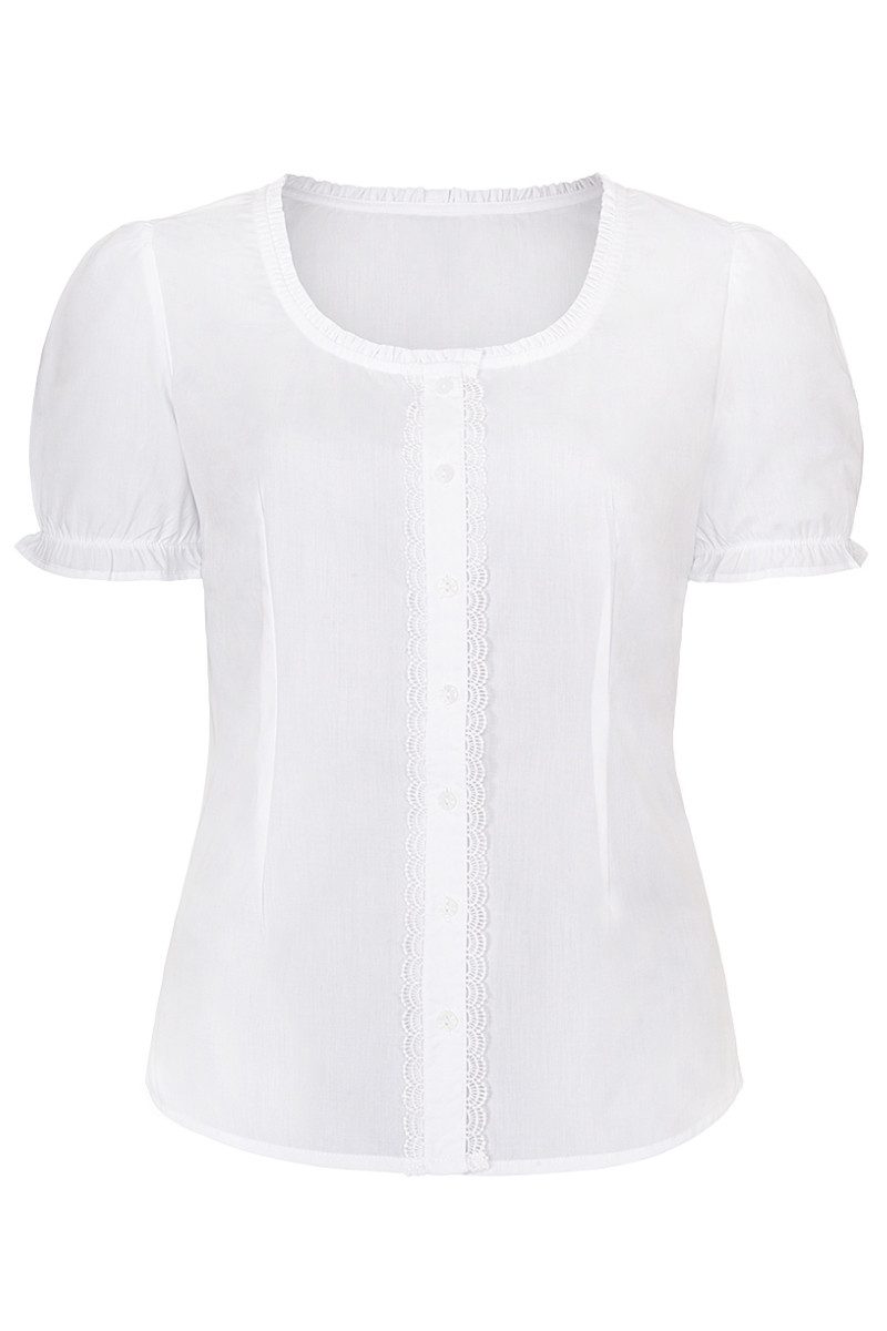 Die bezaubernde Trachtenbluse "Duftnelke" wird mit feiner Baumwolle gefertigt und ist tailliert mit Abnähern inm Brustbereich geschnitten. Den weiten, runden Ausschnitt ziert eine niedliche Raffrüsche und auch die elastischen Bündchen der kurzen Puffärmel ergeben dezente Rüschen. Auf dem linken Ärmel befindet sich eine kleine, fein glänzende Herz-Blüten-Stickerei in Weiß. Mattschimmernde Knöpfe mit einem Blüten-Motiv schmücken die Knopfleiste der Bluse und setzen hübsche Akzente. Beidseitig der Knopflochleiste verläuft eine floral anmutende Spitzenborte, die wellenförmig abschließt. Der Saum ist leicht abgerundet. Die Damenbluse lässt sich vielseitig kombinieren und passt perfekt zu Trachtenrock, -jeans und zur Krachledernen. Ab Размер 48 ist ein Größenzuschlag zu beachten.