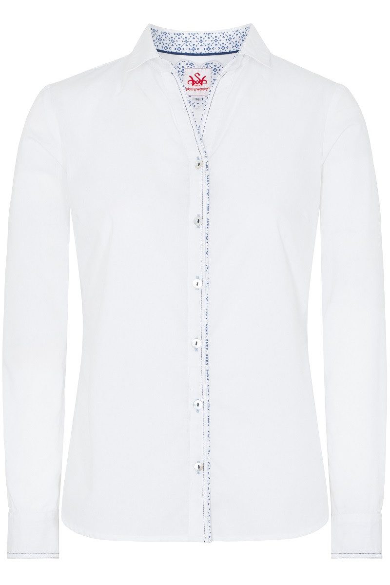 Polarlicht, die sportiv-vielseitige Trachtenbluse mit der Grundfarbe Weiß und farbigen Akzenten, ist tailliert geschnitten, hat lange Ärmel und einen schmalen Kentkragen mit kleinem V-Ausschnitt. Der Kragensteg, die Manschetten, die mit schillernden Knöpfen aus echtem Perlmutt bestückte Knopf- und die Knopflochleiste der stilvollen Damenbluse sind innenseitig mit niedlich floral gemustertem Kontraststoff verstärkt. Das Muster des Kontraststoffes ist gitterförmig aus stilisierten Blüten, Herzen, Spitzovalen und Punkten angeordnet. Der Kontraststoff ist außen sowohl bei der Knopf- als auch bei der Knopflochleiste, die zudem mit einer farbigen Ziernaht betont sind, als Paspelkante sichtbar. Auch die Manschetten haben eine farbige Naht zur Zierde. Die Ärmelschlitze sind mit je einem stoffbezogenen Knopf bestückt und innenseitig mit Kontraststoff verstärkt. Doppelte Nähte aus Kontrastgarn sowie eine kontrastfarbene Stoffborte schmücken die Seiten. Die Nackenpartie ist verstärkt und darunter befindet sich mittig eine eingearbeitete Falte für einen prima Tragekomfort. Der Saum ist leicht gewölbt. Diese großartige Kreation von Spieth & Wensky lässt sich super mit Trachtenjeans und Lederhose kombinieren. Bitte beachten Sie die Übergrößenzuschläge ab Размер 48.