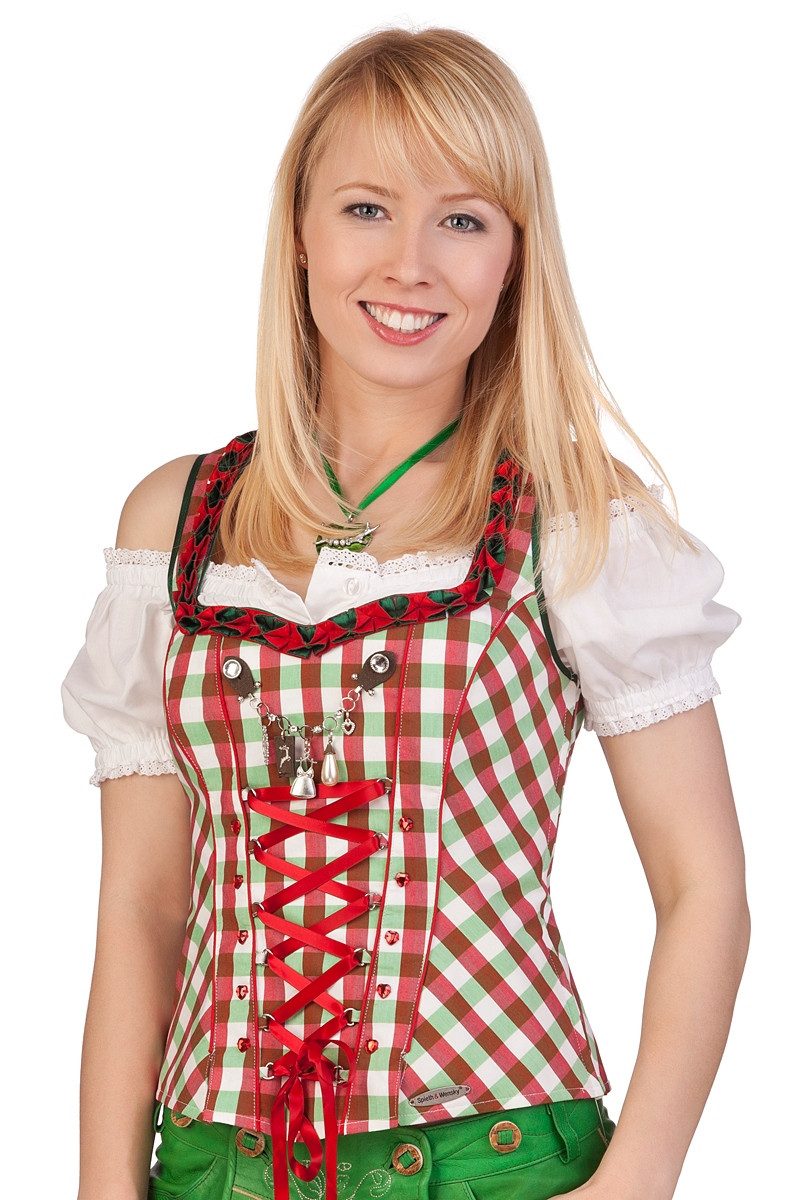 Hier trifft Geschmack und Professionalität auf Trend! Vermischt mit einer sexy Schnittführung und einer angesagten Farbe erhalten wir einen Kracher der Saison. Sehr angenehm ist der relativ lange Schnitt des Mieders. Es reicht in die Taille hinein und ist durch kleine Schlitze an den Teilungsnähten sehr bequem. Ins Auge fällt sofort die original Froschmaulborte entlang des herzförmig geschnittenen Ausschnitts. Liebevoll ist das Mieder durch ein süßes, abnehmbares Charivari verziert und wird mit einem breiten Satinband geschnürt. Kominieren Sie das Mieder mit Lederhosen oder Jeans! Mieder abgefüttert. Teilungsnähte farblich hervorgehoben. Reißverschluß links.
