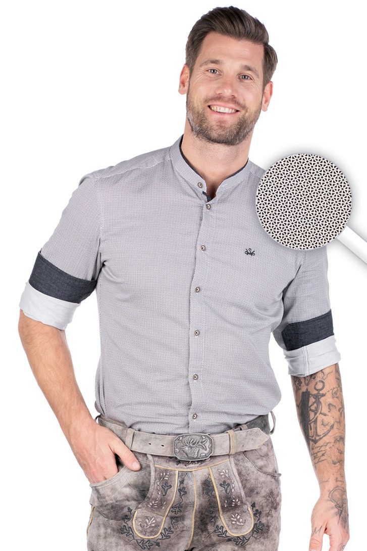 Markanter Look und klarer Schnitt – dieses Herren-Trachtenhemd mit modernem Stehkragen und langen Ärmeln überzeugt durch durchgehenden floralen Print in Dunkelgrau auf Weiß, gefertigt aus reiner, angenehm leichter Baumwolle. Der taillierte Slim-Fit-Schnitt sorgt für eine körpernahe Passform, während verstärkte Details an Kragen, Knopfleiste und Ärmelschlitz für Stabilität und Komfort stehen. Knöpfe in rustikaler Hirschhorn-Optik, eine dezente Logo-Stickerei und Kontrastakzente an Paspel, Manschetten und Seitennähten unterstreichen das durchdachte Design. Ein vielseitiges Hemd – klassisch zur Lederhose oder modern zur Jeans. Auch in Dunkelblau (AW-18514) erhältlich.