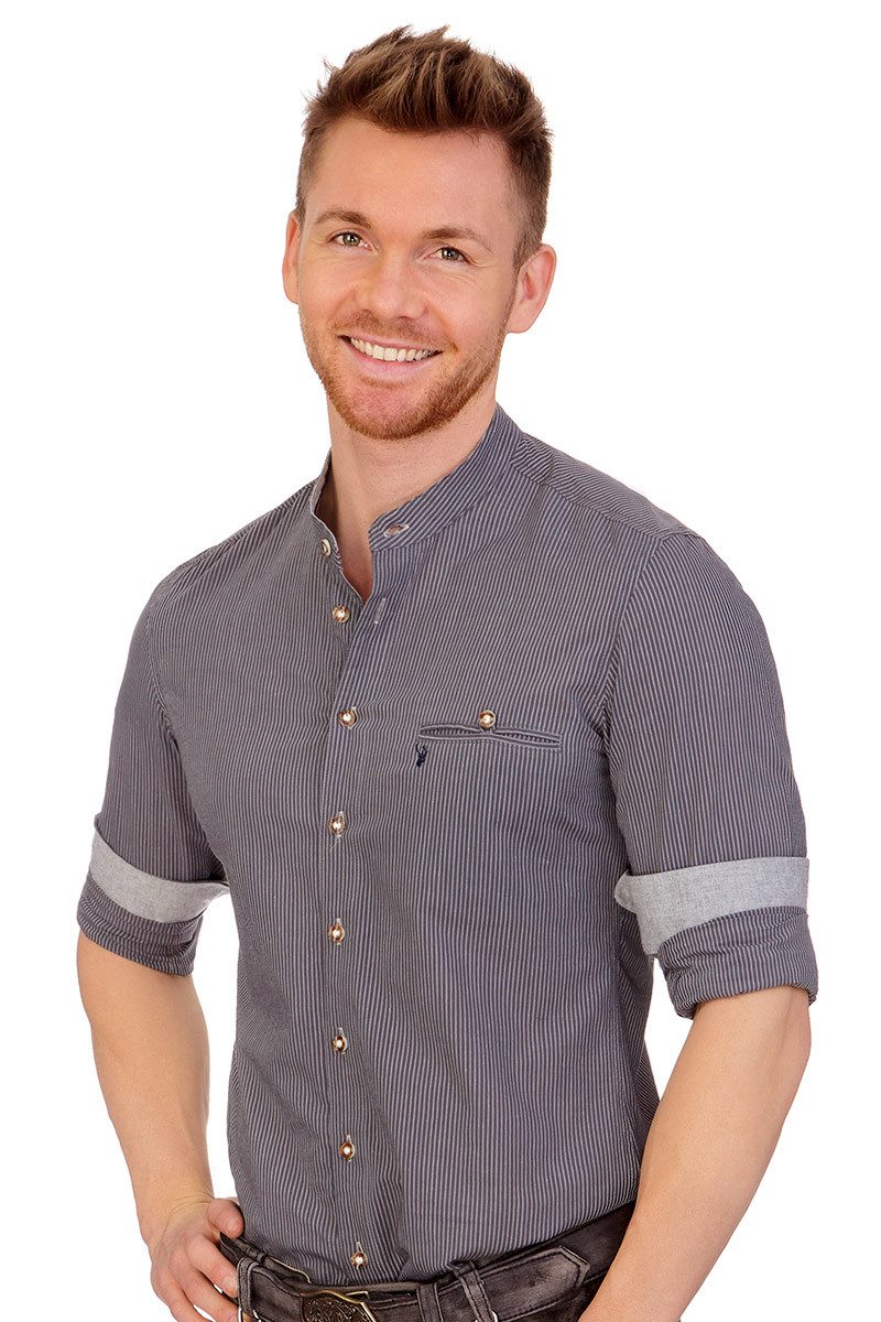 Norm, das elegant-kernige Trachtenhemd im zarten Streifen-Look, ist eine stylische Kreation aus dem Hause Spieth & Wensky. Es besteht aus feiner Baumwolle in schöner, leichter Stoffqualität, hat einen leicht taillierten Slim Fit-Schnitt, einen traditionellen Stehkragen und lange Ärmel. Das allover aparte Streifen-Webmuster mit zarten hellgrauen Streifen auf dunkelgrauem Grund macht das stilvolle Herrenhemd zusammen mit Lederhose und Trachtenjeans optimal für viele Anlässe. Der schöne Stehkragen ist innen mit Kontraststoff verstärkt und mit einer Stoffborte verziert. Links gibt es eine eingearbeitete, doppelte Paspeltasche mit Knopf und einer kleinen Hirschkopf-Stickerei darunter. Urige Knöpfe in Hirschhorn-Optik schmücken die Knopfleiste. Die langen Ärmel haben abgerundete, durch zwei Knöpfe weitenverstellbare Manschetten, bei denen der Stoff um 90° gedreht ist und die innen mit Kontraststoff verstärkt sind, und Ärmelschlitze mit Knopf. Die feschen Stockzwickel an den Seitennähten unten am leicht gewölbten Saum sind aus Kontraststoff gefertigt. Das Hemd ist auch in Hellgrau und Blau erhältlich. Bitte beachten Sie den Größenzuschlag bei Размер 49/50 (4XL).