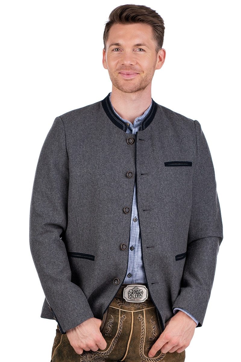 Dieser schmucke Herren Janker "Balduin" im Loden-Look wird mit weicher Wolle im feinen Melange-Style mit tollen Kontrasten gefertigt. Der Stehkragen in Dunkelblau ist mit einem dezenten, leicht glänzenden Zierstick in Grau veredelt. Die Knopf- und Knopflochleiste sind innen verstärkt und außen mit einer feinen Paspelkante im Loden-Look in Dunkelblau gestaltet. Urige Knöpfe im geschwungenen Holz-Design ergänzen das Gesamtbild. Die Brusttasche auf der linken Seite sowie die Eingrifftaschen sind mit einer doppelten Paspel im Loden-Stil in Dunkelblau betont. An den Ärmelenden befinden sich jeweils zwei Deko-Knöpfe im Holz-Style auf Loden-Stoff in Dunkelblau. Die Rückseite der Trachtenjacke ist unten mittig überlappend geschlitzt. Das angenehme Futter im Satin-Look in Dunkelblau zeigt ein Webmuster aus kleine Ornamentik-Blüten und Innentaschen auf beiden Seiten bieten zusätzlichen Stauraum. Dieser Janker für Herren passt hervorragend zur Lederhose und zum Trachten-Outfit. Bitte beachten Sie ab Размер 58 die Größenzuschläge.