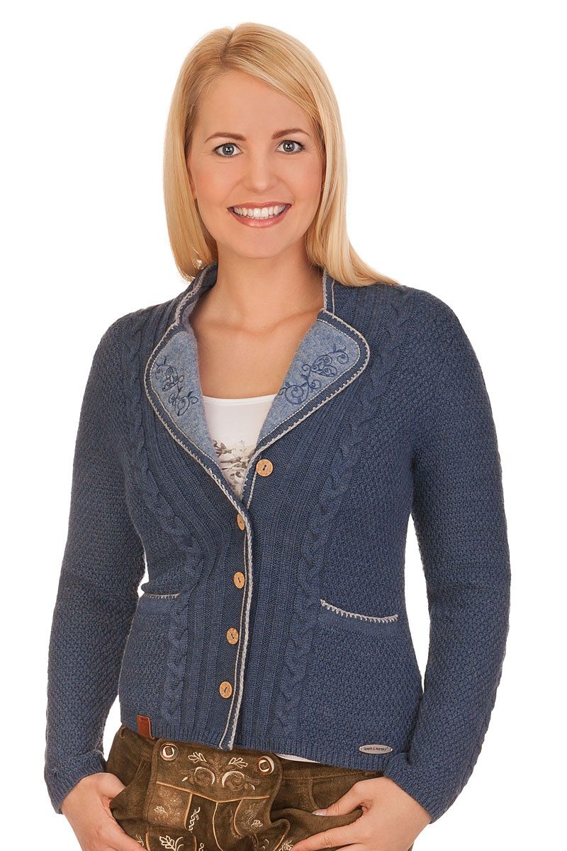Die wundervolle Strickjacke Farchant mit ihrem schönen Zopfmuster auf der Vorder- und Rückseite bezaubert im feschen Landhausstyle. Auf den Ärmeln setzt sich dieses hübsche Zopfmuster fort und endet mit abgesetzten, gestrickten Bündchen. Ihr taillierter Schnitt und das herrliche Revers mit liebevoller Stickerei macht sie zu einem eleganten Begleiter zu jedem Anlass. Ein süßer Blickfang sind auch die farblich abgesetzte Paspeln am Kragen und Knopfleiste sowie die verzierten Knöpfe aus echter Kokosnuss. Die Jacke besteht aus kuschelig warmer und wollig weicher Merinowolle und bringt sie gut durch kühleres Wetter. - Eine tolle Jacke der Marke Spieth und Wensky -