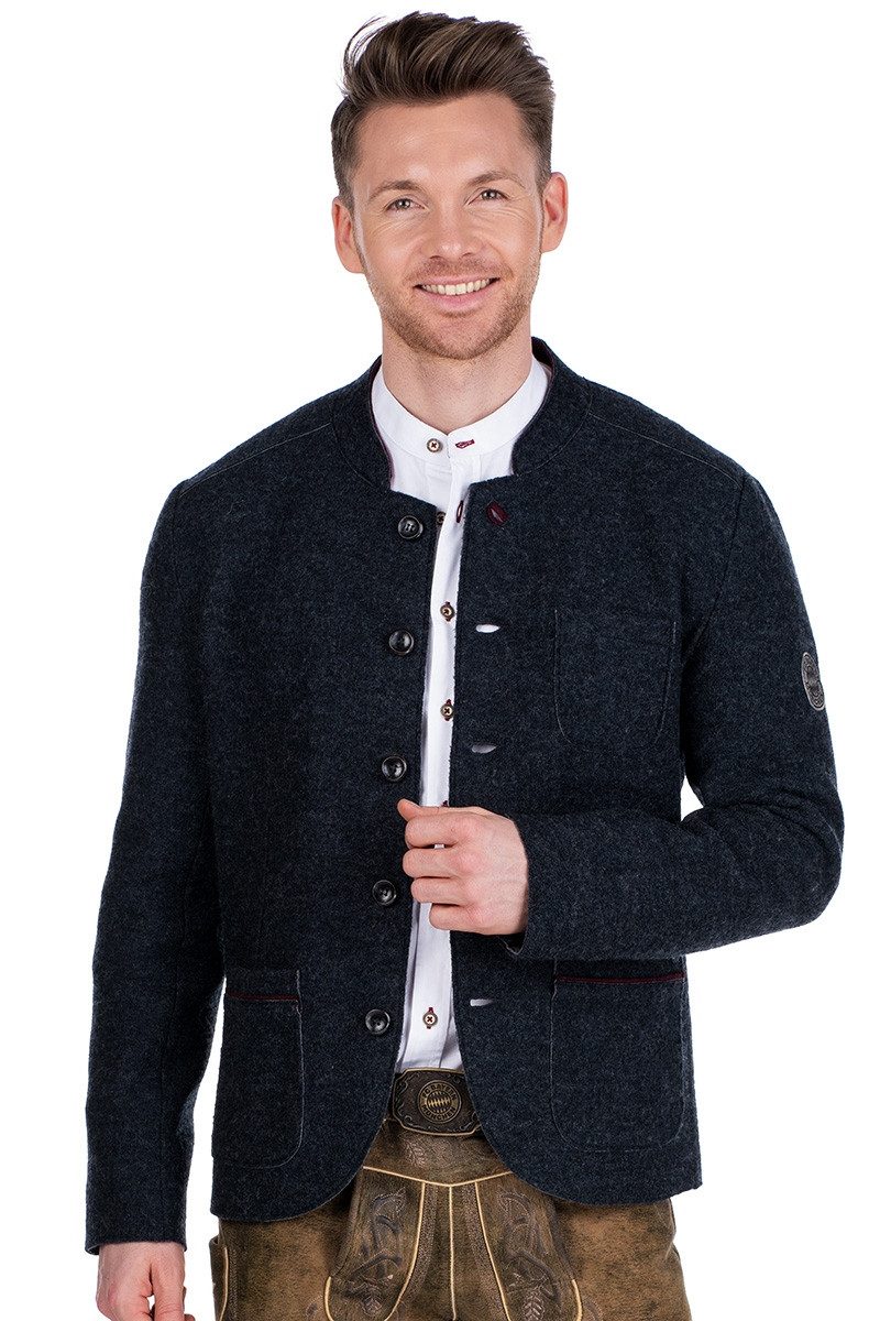 Die kernige Trachten Herren Walkjacke Bonifaz aus der FC Bayern München Fan-Kollektion besteht aus angenehmer Wolle, hat einen leicht taillierten Schnitt, einen Stehkragen und Saumkanten im modischen offenen Style. Der Kragen ist innenseitig mit Kontraststoff in Burgund verstärkt und die Knopfleiste zieren schick geschwungene Knöpfe im Holz-Look. Links gibt es eine kleine, aufgesetzte Tasche. Die großen, beidseitig vorn aufgesetzten Taschen sind mit einer feinen Paspel in Burgund verziert. Auf dem linken Ärmel schmückt ein glänzender, runder Patch in Silbergrau/Schwarz mit dem gestickten Vereinsnamen sowie -Logo den Janker. Für einen angenehmen Tragekomfort sorgt das gebondete Futter aus Baumwoll-Jersey. Bitte beachten Sie den Größenzuschlag bei Размер 58.