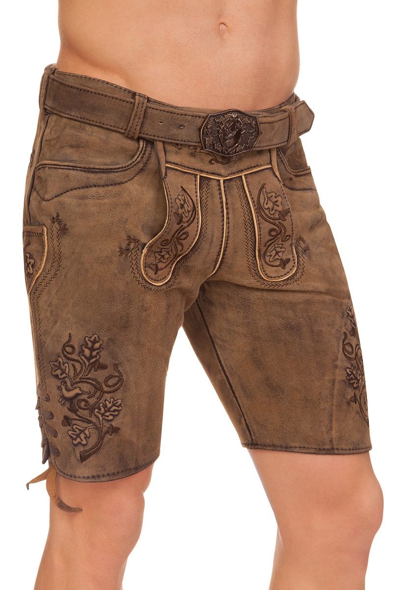 Die fesche, kurze Lederhose Kuno im urigen Design von der Trachtenmarke Spieth & Wensky zeigt sich traditionell und trendy. Sie besteht aus geschmeidigem Wildbock-Veloursleder mit krachigen Used-Effekten und hat am Latz rustikale Knöpfe tierischen Ursprungs in Hirschhorn-Optik. Auf dem Latz, an den Beinen und auf der Messertasche sind traditionelle Hohlstickereien sowie Stickereien mit Kontrastgarn eingearbeitet. Die Hohlstickereien haben eine Eichenblatt-Form und an den Beinen zusätzlich die Form eines springenden Bocks; die Stickereien besitzen die Motive Eicheln und Ranken. Um den Latz, auf der Messertasche und seitlich an den Hosenbeinen befinden sich außerdem feine Zierstickereien. Latz und Messertasche sind mit Keder verschönert. Vorn, hinten und an den Seiten ist die Hose auf Spalt genäht. Vorn gibt es zwei Eingrifftaschen mit dezenter Ziernaht und hinten eine Eingrifftasche mit Paspeln und zünftigem Knopf. Der Beinabschluss wird seitlich mit einem Lederband geschnürt. Für den richtigen Sitz sorgt der typische Zwickel mit Schnürung hinten am Bund. Ein schöner Gürtel mit Koppelschließe mit Hirsch-Laub-Motiv ist im Lieferumfang enthalten. Bitte beachten Sie den Übergrößenzuschlag ab Размер 58.