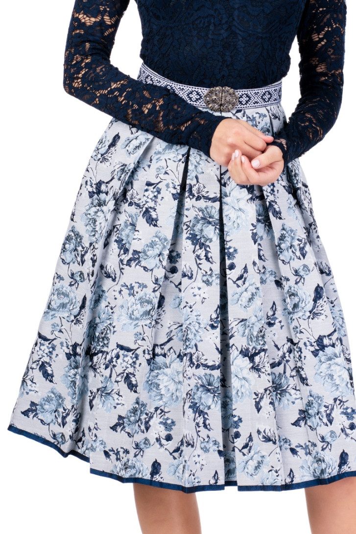 Dieser edle Trachtenrock vereint Tradition und modernen Charme in einem stilvollen Design. Die schmeichelhafte A-Linie aus Jacquard-Stoff wird von einem kunstvollen Blüten-Webmuster in harmonischen Blau- und Grautönen verziert. Feine Details wie das silberne Marken-Emblem mit Herzmotiv am Bund, der verdeckte Reißverschluss und die praktische Eingrifftasche sorgen für Komfort und Eleganz zugleich. Der schwungvolle Rockteil mit schmalen Kellerfalten unterstreicht die feminine Silhouette, während der marineblaue Taft-Saum einen stilvollen Kontrast setzt. Abgerundet wird das Design durch einen elastischen Folklore-Gürtel in Dunkelblau-Weiß mit filigraner Ornamentik-Schließe in Silber – perfekt kombinierbar mit Trachtenbluse oder Body für einen rundum gelungenen Look.