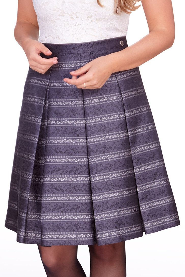 Dieser fabelhafte Trachtenrock namens Witten stammt aus dem Hause Spieth & Wensky und lässt sich fantastisch zu Trachtenbluse und Blusenbody kombinieren. Er aus wundervoll schimmerndem Jacquard im stilvollen Querstreifen-Design in ausgestellter A-Linie mit breiten, adretten Kellerfalten gefertigt. Das Webmuster zeigt zweierlei Blumenranken-Motive und Linien bzw. zarte Pünktchen. Die breiten Ranken sind dunkel gehalten, die schmalen Ranken und die Linien in Hellsilber gestaltet. Geschlossen wird der elegante Damenrock mit einem Knopf sowie einem verdeckten Reißverschluss hinten mittig am schmalen, verstärkten Bund. Der Ösenknopf hat einen silbernen Rahmen und einen Einsatz mit funkelndem Facettenschliff. Rechts gibt es eine Eingrifftasche und der Unterrock aus Satin in Bleigrau sorgt für einen super Tragekomfort.