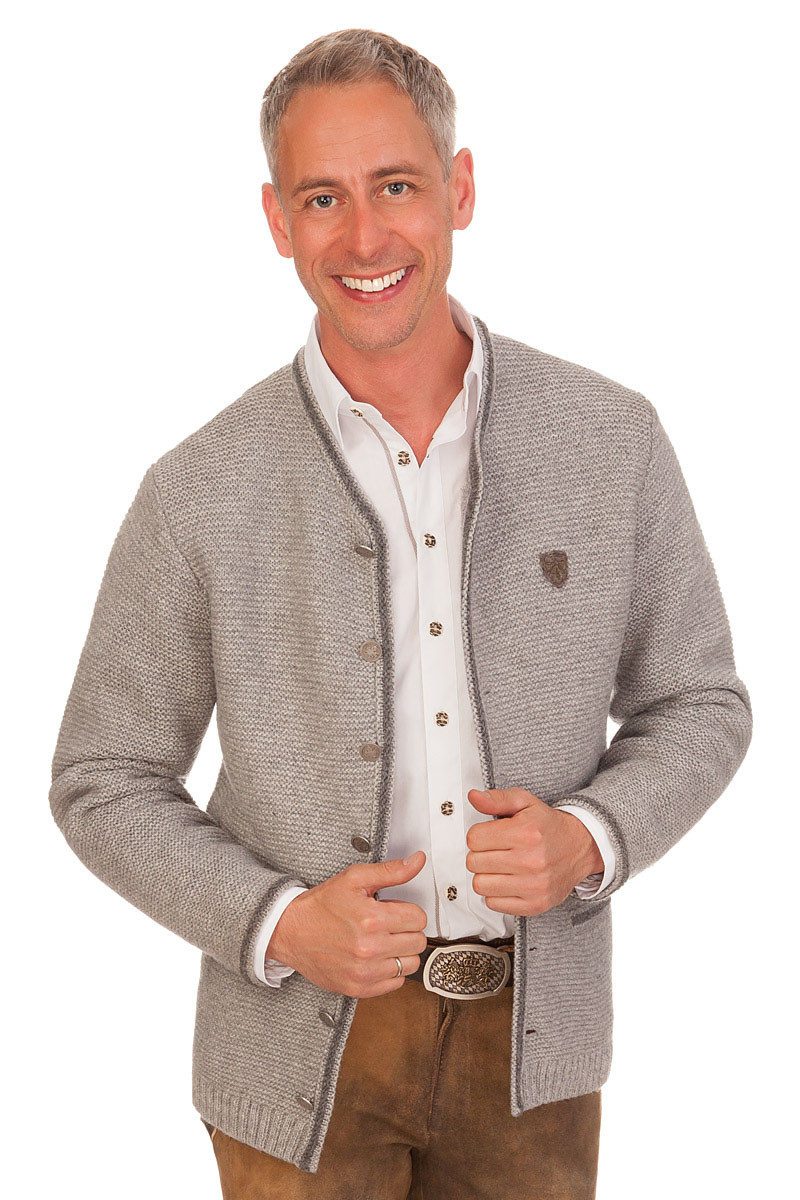 Die zünftige Herrenstrickjacke Gottfried ist genau das richtige Kleidungsstück bei kühleren Temperaturen. Mit der weichen, feinen Merinowolle ist sie eine wollig warme Jacke, die angenehmen Tragekomfort bietet. Zudem ist sie ordentlich fesch mit ihren schönen Strickmuster in Hebemaschen-Form, den traditionellen Münzknöpfen, der hübschen Walkapplikation mit kleinem Wappen und Eichenblättern auf der linken Brust und der kleinen Hirschkopfstickerei am rechten Arm unten. Der Kragen, die Knopfleiste, die Bündchen am Arm und die zwei Eingrifftaschen vorn sind farblich schick betont und das angenehme Innenfutter im Nackenbereich besteht aus einem trachtigem Karostoff.