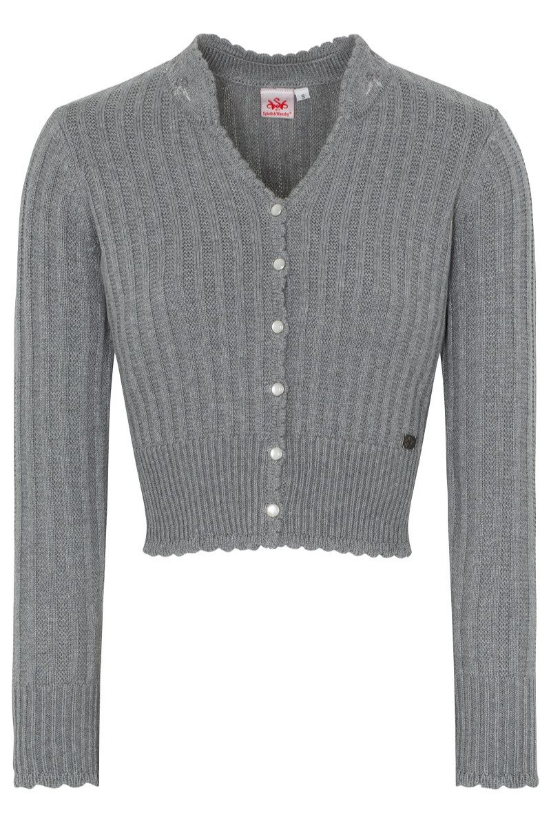 Pfiff, die verlockende, kurze Trachten Strickjacke für Damen in Mittelgrau bzw. Nachtblau, hat einen angenehm weichen Baumwoll-Anteil sowie allover ein stilvolles Streifen-Muster aus Links- und Rechtsstrick. Der elegante Stehkragen in feinem Rippenstrick ist beidseitig zauberhaft mit floralen Stickereien veredelt. Vorn gibt es einen kleinen V-Ausschnitt, der an der mit edlen, schön schimmernden Knöpfen bestückten Knopfleiste endet. Die breiten Bündchen und der breite Bund der entzückenden Strickjacke sind in Rippenstrick gefertigt. Sowohl Kragen als auch Ausschnitt, Knopf-, Knopflochleiste und Bund schließen wellenförmig ab. Über dem Bund vorn links ist ein kleines Marken-Emblem aus Metall angebracht. Diese hinreißende Kreation von der Trachtenmarke Spieth & Wensky lässt sich traumhaft zu Trachtenjeans, Lederhose, Trachtenrock und Dirndl kombinieren.