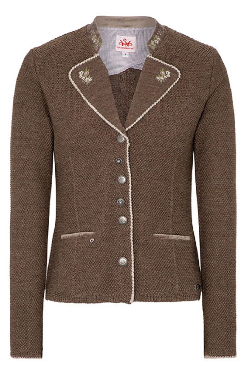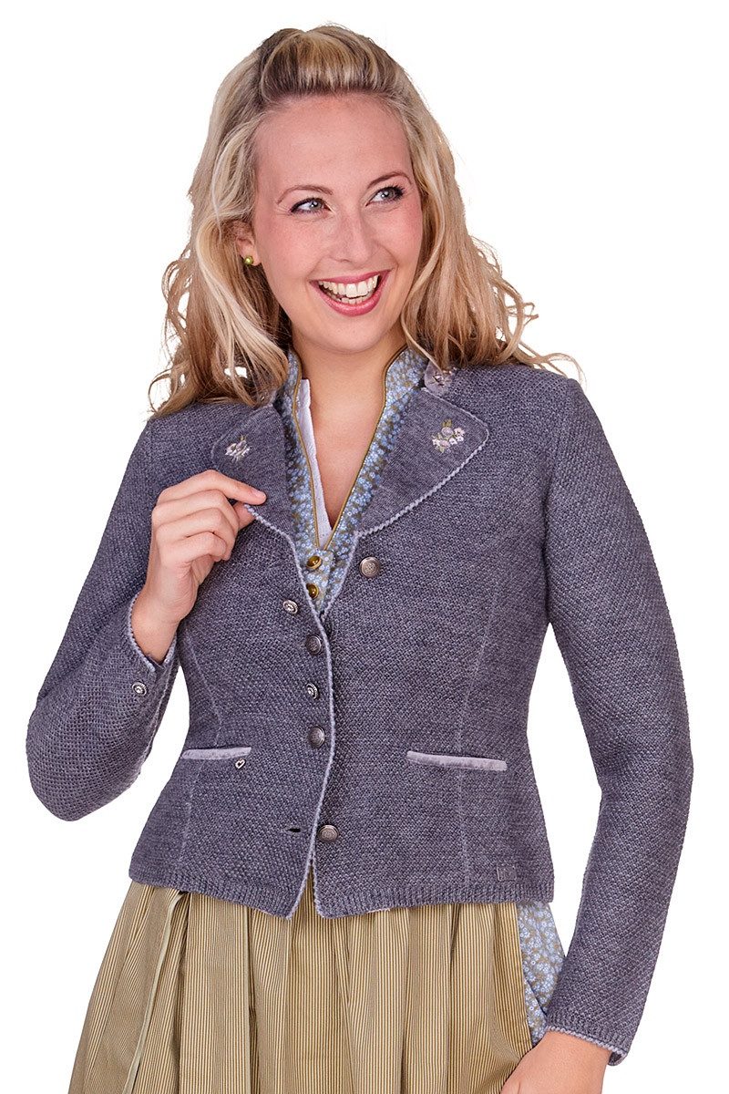 Die exquisite Strickjacke namens Süssklee, eine wundervolle Kreation im Blazer-Stil aus dem Hause Spieth & Wensky für Damen, wird mit viel weicher Merinowolle gefertigt, ist tailliert geschnitten und hat allover ein schmuckes Strickmuster im Rautengitter-Look. Bund und Bündchen sind gerippt. Den schicken Stehkragen aus Samt-Material zieren beidseitig vorn niedliche Blumen-Stickereien, die Blütenstempel sind teils mit glitzernden Strasssteinchen veredelt. Das elegante Revers aus Feinstrickmaterial ist ebenfalls mit fein glänzenden Blumen-Stickereien dekoriert. Sowohl das Revers, die innen mit Feinstrick-Material verstärkten Knopf- sowie Knopflochleiste und die Bündchen haben eine stilvolle Kontrastkante. Vier altsilberne Ösenknöpfe mit zartem, floralem Motiv sowie zwei silberglänzende Ösenknöpfe mit floralem Reliefmuster und Strassstein schmücken abwechselnd die Knopfleiste. Die beiden Eingrifftaschen vorn sind als einfache Paspeltaschen aus Samt gefertigt; die rechte hat zudem einen süßen Herz-Anhänger zur Zierde. Vorn links über dem Saum ist ein Marken-Emblem aus Metall angebracht. Komplett wird das Design durch das fantastische, breite Zopfmuster mittig längs auf dem Rücken, den Feinstrick-Riegel mit altsilberner Ornamentik-Schnalle sowie der eingearbeiteten, v-förmigen Kellerfalte mit Feinstrick-Einsatz darunter. Der Nackenbereich ist gefüttert. Die Damen Trachten Strickjacke lässt sich zauberhaft zu Trachtenrock und Lederhose kombinieren.