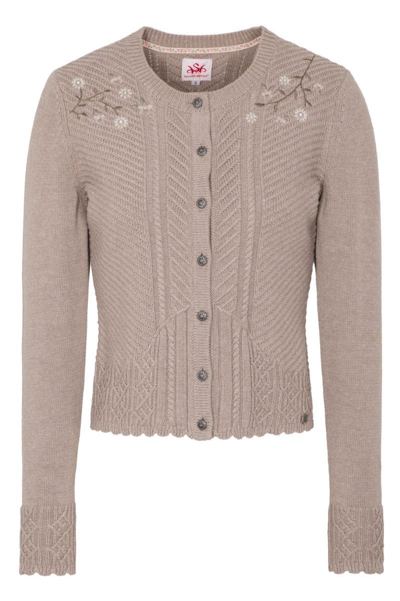 Die liebliche, kurze Trachten Strickjacke Weda - eine traumhafte Kreation in Flaschengrün bzw. Helltaupe für Damen von der Marke Spieth & Wensky - wird tailliert mit angenehmer, weicher Baumwolle gefertigt und hat eine fantastische Strickmuster-Komposition. Der Rundhals-Ausschnitt ist im Rippenstrick-Stil, die Vorder- sowie Rückseite sind in Rechtsstrick mit eingestrickter, diagonaler Rippenstruktur gestaltet, beiseitig neben der Knopfleiste sowie hinten befinden sich herrliche, toll kombinierte Strick-Arrangements aus Links-, Zopf- und Rechtsstrick mit Querrippen-Struktur, die Ärmel haben ein klassisches Rechtsstrick-Muster und den Jackenabschluss sowie die Bündchen sind fabelhaft im Aranstrickmuster-Look gearbeitet. Sowohl der Bund und die Ärmelbündchen schließen wellenförmig ab. Perfekt wird die entzückende Damen Strickjacke durch die leicht glänzenden, farblich passenden Blumenranken-Stickereien, deren Blütenstempel der fünfblättrigen Blüten mit glitzernden Strasssteinchen besetzt sind, und die Ornamentik-Ösenknöpfe in Altsilber mit Blüten. Über dem Saum vorn links befindet sich zudem ein rundes, altsilberfarbenes Marken-Emblem aus Metall mit Logo und Herz-Motiv. Die hinreiße Strickjacke lässt sich bezaubernd zu Dirndl, Trachtenrock, -Jeans und Lederhose kombinieren.