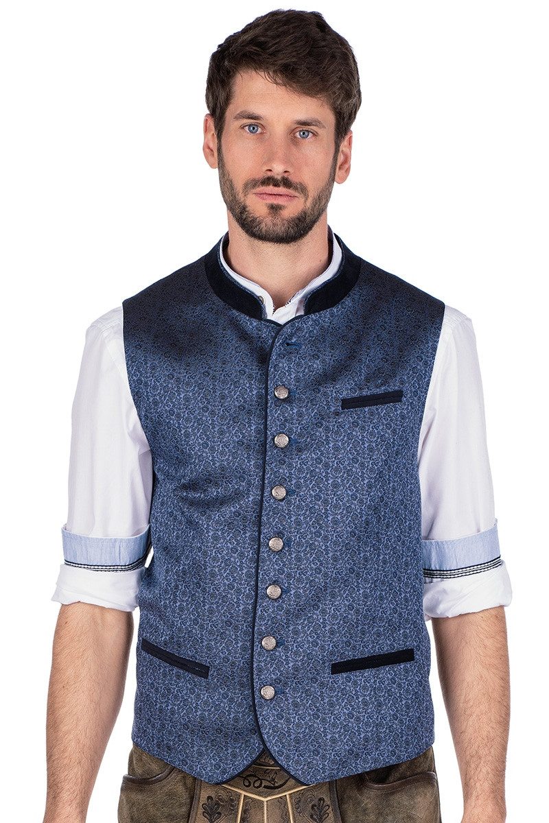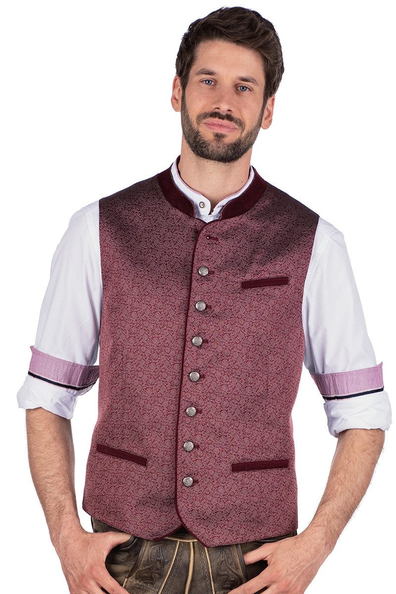 Diese erlesene, leicht taillierte Herren Trachtenweste "Benson" im edel schimmernden Jacquard-Style in den Farbvarianten Marsala/Dunkelrot bzw. Jeans/Dunkelblau hat vorn ein florales Webmuster aus zarten Ornamentik-Blumenranken in Mauve bzw. Dunkelblau mit cremefarbenen Akzenten auf einem Untergrund in Marsala bzw. Jeansblau. Der schöne Stehkragen aus Samt in Dunkelrot bzw. Dunkelblau ist innenseitig mit Jacquard verstärkt, der als Paspel sichtbar ist. Auch die Knopf- sowie Knopflochleiste haben eine Paspelkante aus Samtmaterial zur Zierde. Die Knopfleiste schmücken herrliche Ösenknöpfe in Altsilber mit schickem Wappen-Motiv. Auf der Vorderseite des Gilets gibt es eine Brusttasche links und beidseitig Eingrifftaschen - allesamt mit doppelten Samtpaspeln in Dunkelrot bzw. Dunkelblau. Perfekt wird die festliche Herrenweste durch den Rücken aus Lyocell-, Leinen- sowie Stretch in Dunkelgrau mit dezentem Webmuster, dem regulierbarem Rückenriegel sowie das angenehme Innenfutter mit der Innentasche mit Knopf links. Bitte beachten Sie die Größenzuschläge ab Размер 58.