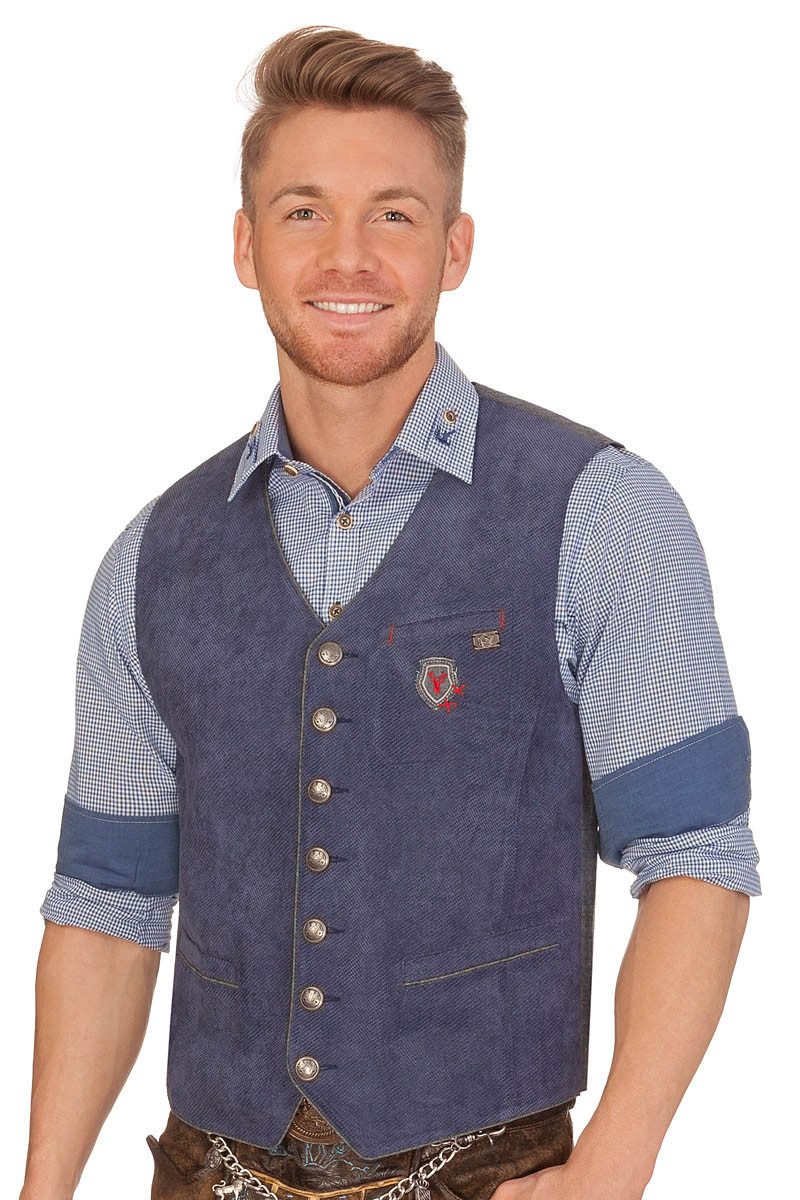 Die stylische Herrenweste Gerit aus samtig weichen Waffelcord mit ihren Wappen verzierten Münzknöpfen ist eine moderne Trachtenweste im jungen, trendigen Look aus dem Hause Spieth und Wensky. Die Weste besitzt auf der Vorderseite zwei Eingrifftaschen, sowie eine Brusttasche links mit schöner, rustikaler Stoffapplikation in Wappenform und feschen Kontrastnähten. Der Westenrücken überzeugt in feiner Denim-Optik. Am Rücken sitzt gut der Rückenriegel mit Trachtenknopf und edler Stickerei zur individuellen Weiteneinstellung und für den perfekten Sitz. Das Innenfutter besteht aus schicken Satin. An der Innenseite befindet sich eine mit Knopf verschließbare Tasche. Ausschnitt und Knopfleiste sind hübsch abgepaspelt. Rundum ist dieses Prachtexemplar ein herrllich, frisches Trachtenstück.