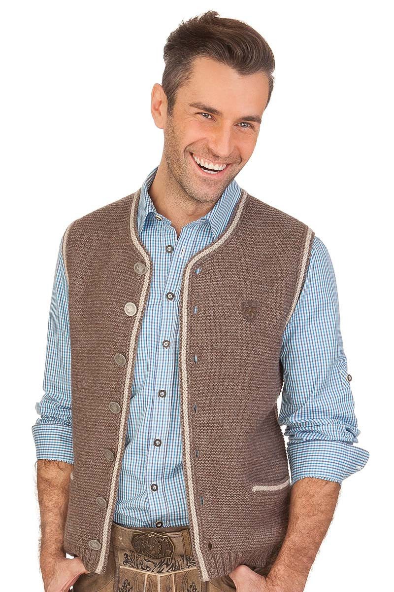 Die zünftige Herrenstrickweste Götter ist genau das richtige Kleidungsstück bei kühleren Temperaturen. Mit der weichen, feinen Merinowolle ist sie eine wollig warme Weste, die angenehmen Tragekomfort bietet. Zudem ist sie ordentlich fesch mit ihren schönen Strickmuster in Hebemaschen-Form, den traditionellen Münzknöpfen, der hübschen Walkapplikation mit kleinem Wappen und Eichenblättern auf der linken Brust und der kleinen Hirschkopfstickerei über der rechten Tasche. Der Kragen, die Knopfleiste, die Armausschnitte und die zwei Eingrifftaschen vorn sind farblich schick betont und das angenehme Innenfutter im Nackenbereich besteht aus einem trachtigem Karostoff.