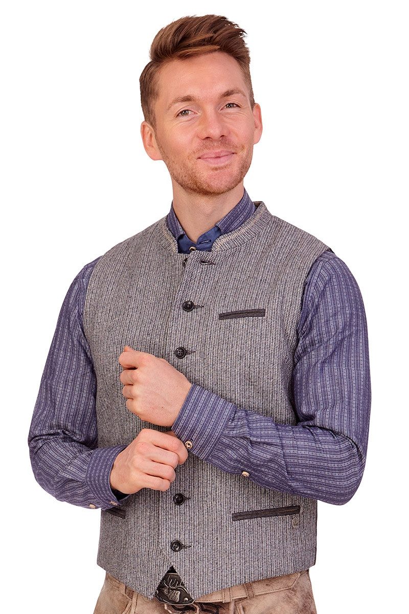 Das urige Gilet Tann aus dem Hause Spieth & Wensky ist leicht tailliert geschnitten und mit viel Wolle gefertigt. Die Vorderseite hat ein krachiges Webmuster aus gestrichelten Linien und ist mit angenehmem Futter aus Jersey-Material gebondet; der Rücken besteht aus leicht gewalktem Rechtsstrick. Der schicke, innen mit Cordstoff verstärkte Stehkragen aus Webstoff ziert oben ringsum eine leicht glänzende Stickerei im Ranken-Stil. Die Knopfleiste der kernigen Trachtenweste zieren elegant geformte Knöpfe im Holz-Look. Knopf- sowie Knopflochleiste sind innen verstärkt. Der Vorderteil der Herrenweste verfügt über eine Brusttasche links und zwei Eingrifftaschen vorn - allesamt mit doppelten Paspeln aus Walkmaterial in Kontrastfarbe und Taschenfutter aus Cordmaterial. An der linken Tasche ist ein kleines Marken-Emblem mit Jahreszahl aus Metall angebracht. Die Weste lässt sich fantastisch zur Krachledernen und Kniebundlederhose kombinieren.