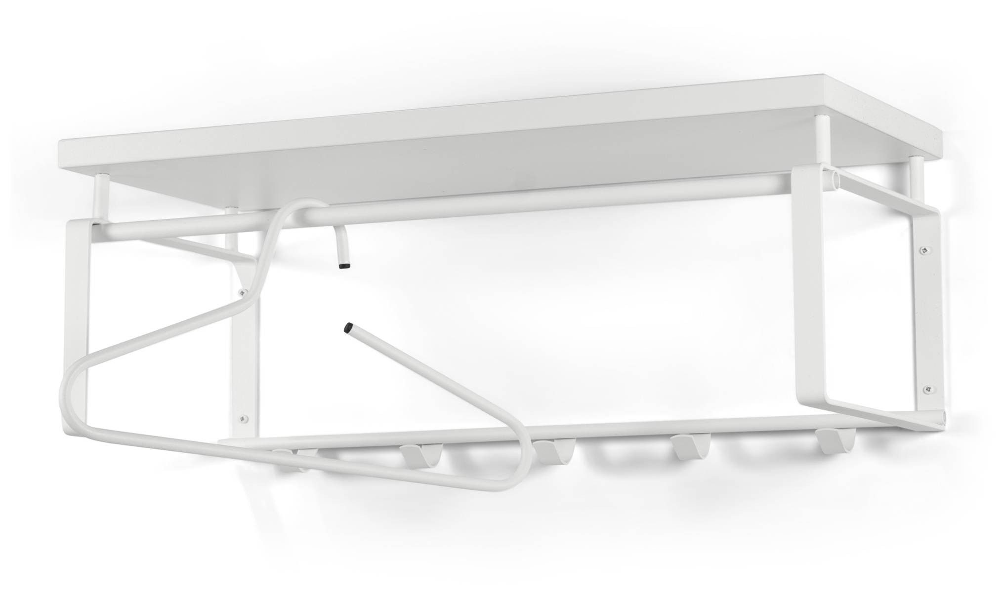 Sie bietet ausreichend Platz für ihre Garderobe oder Jacken, Mäntel und Hüte Ihrer Gäste. Das Gestell der Garderobe REX 3 wird aus Stahl gefertigt und ist weiß pulverbeschichtet. Die Hutablage besteht aus einer weiß beschichteten MDF-Platte, die der robusten Konstruktion zusätzliche Stabilität verleihen.