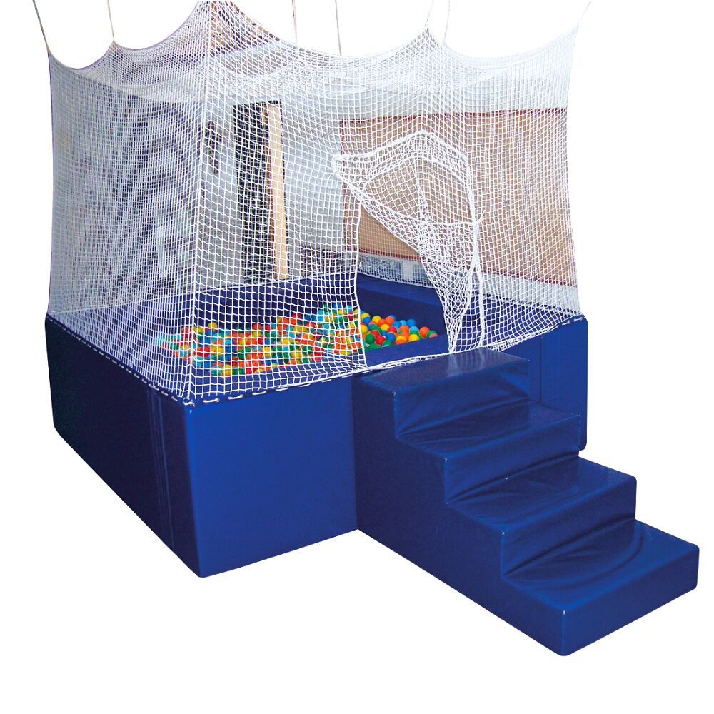 Mit dem Sport-Thieme Bällebad-Set "Maxi" mit Netzabhängung richten Sie eine ganz besondere Spielecke für Kinder ein: Das Netz löst dabei das Problem der ewigen Suche nach verschwundenen Kugeln auf elegante Weise. Außerdem schafft das Netz einen abgeschlossenen Spielbereich, in dem sich die Kinder geborgen fühlen können. Das Kugelbad besteht aus 4 Schaumstoffelementen, die mit einer äußerst strapazierfähigen und pflegeleichten Polyesterplane bezogen sind und einem rutschfesten Boden. An die fest angenähten Schlaufen am oberen Rand des Kugelbades wird ein 2,3 mm starkes Polypropylen-Schutznetz angebracht. Die Maschenweite beträgt 30 mm.