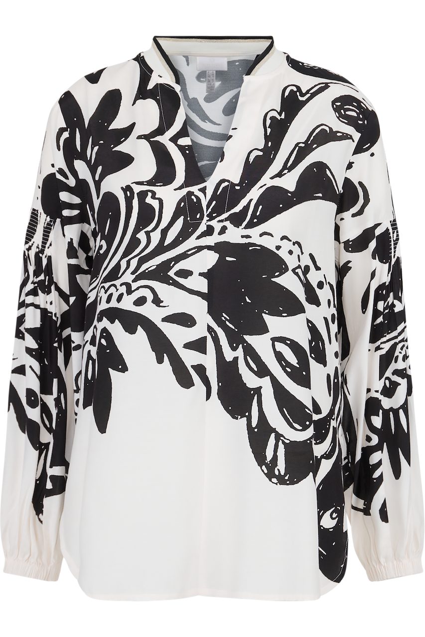 Longbluse mit auffälligem Paisley-Muster und raffinierten Ärmeln mit Falten-Detail. Der V-Ausschnitt mit Stehkragen und der unsichtbare Gummibund am Abschluss runden den Look perfekt ab.