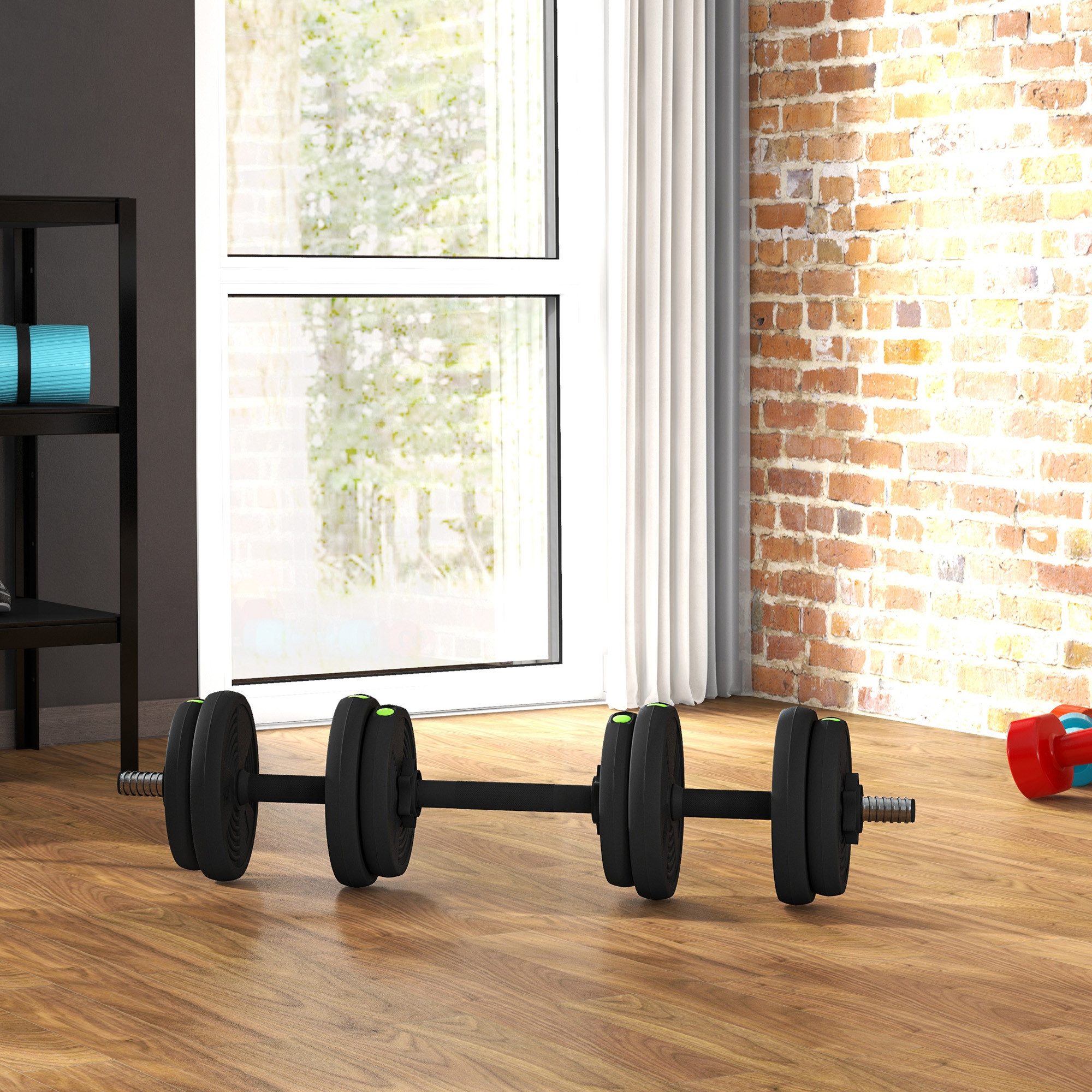 ● Einfach umwandelbar von Kurzhanteln zu einer Langhantel für vielseitiges Training ● Verstellbares Gewicht des Dumbbell Sets für individuell angepasste Trainingsintensität ● Rutschfeste Griffe des Hantel Sets garantieren sichere Handhabung während des Trainings ● Kunststoffbeschichtung verringert Lärm und schützt den Boden vor Beschädigungen ● Sichere Verschlüsse fixieren die Gewichtsscheiben zuverlässig