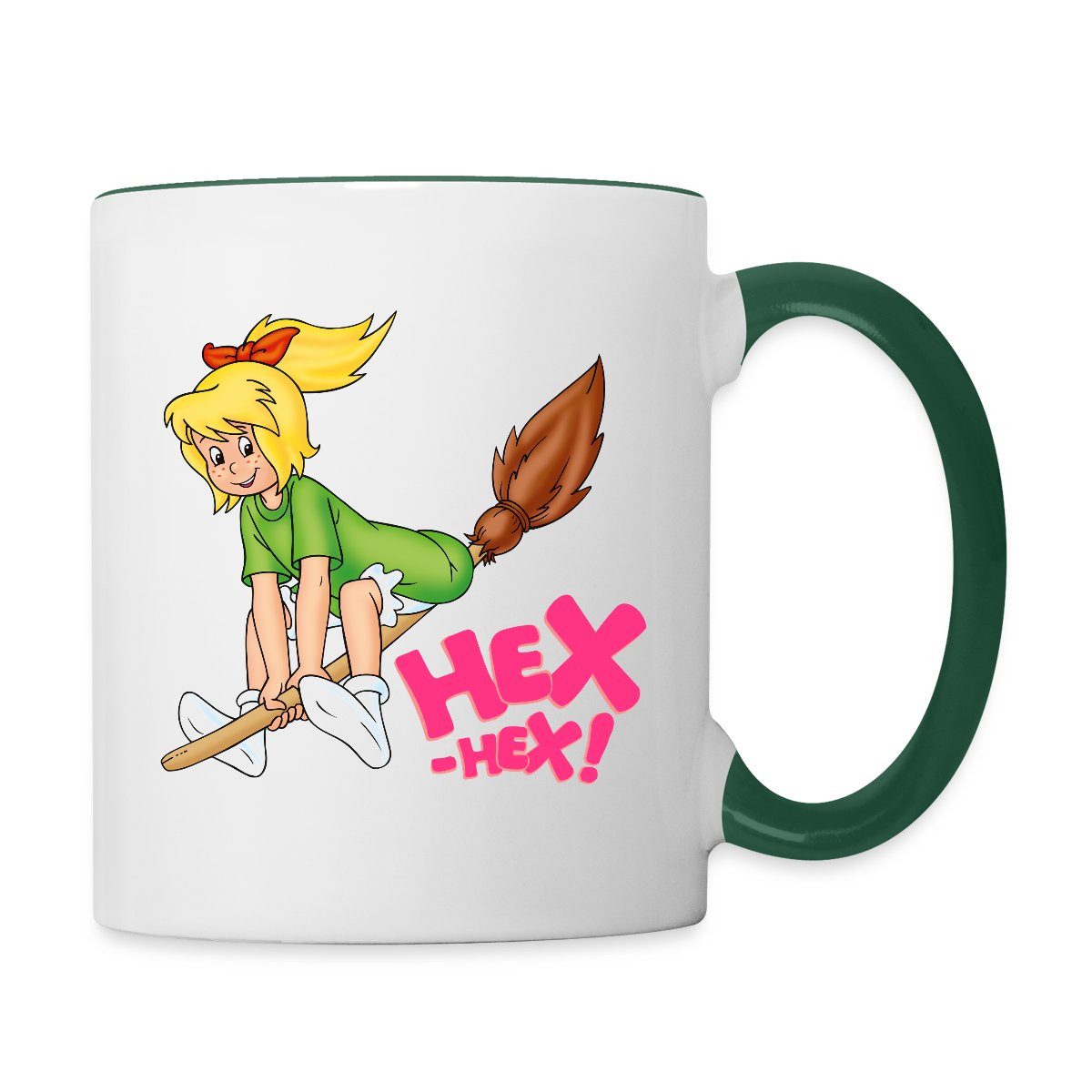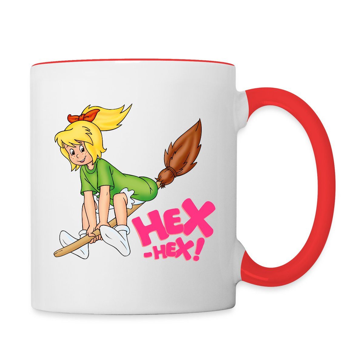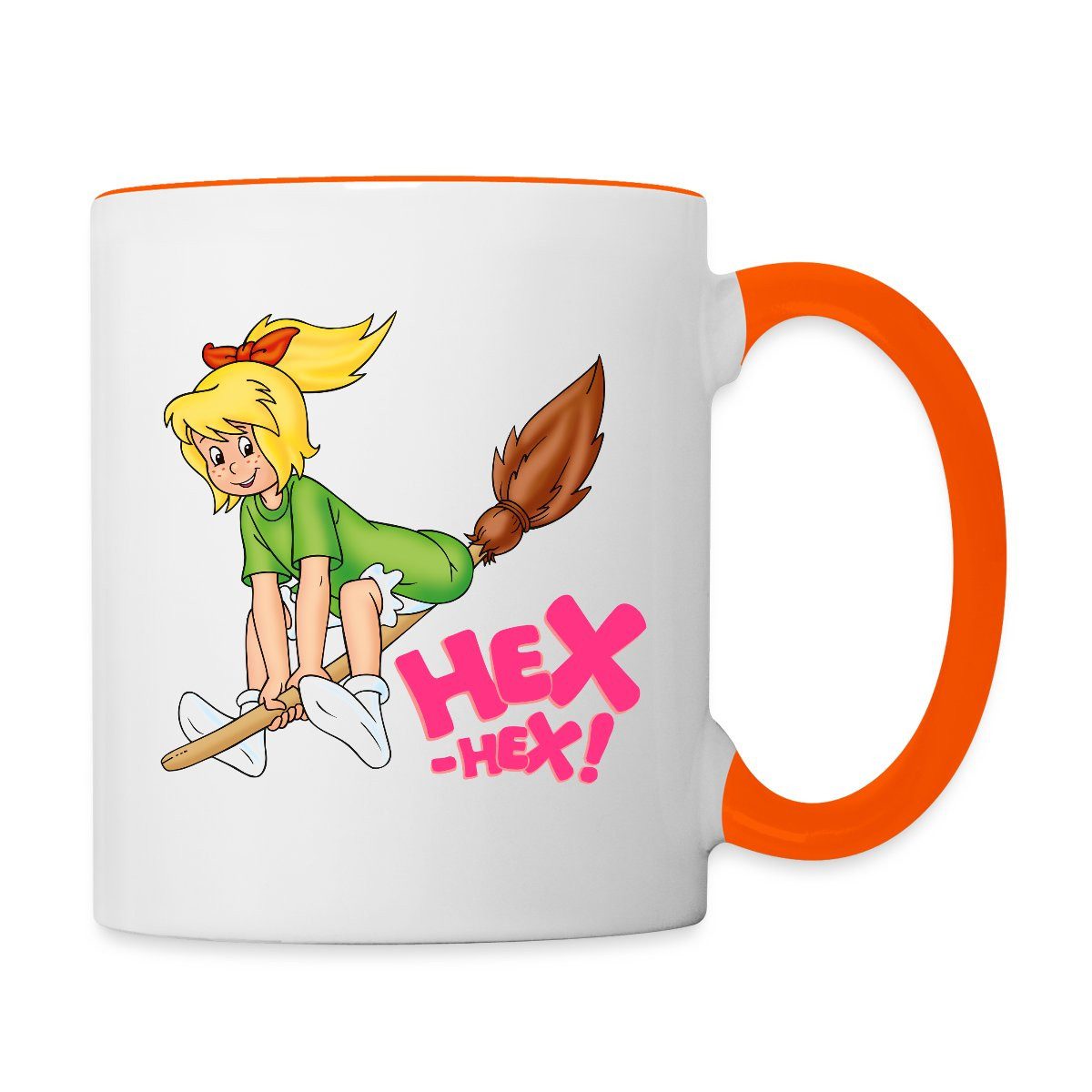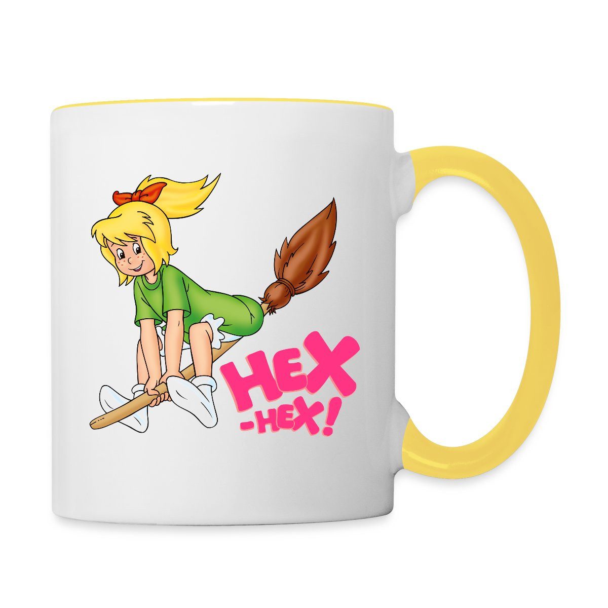 Die kleine Hexe Bibi Blocksberg fliegt auf ihrem Besen Kartoffelbrei - und ruft dabei 'Hex-Hex!'.