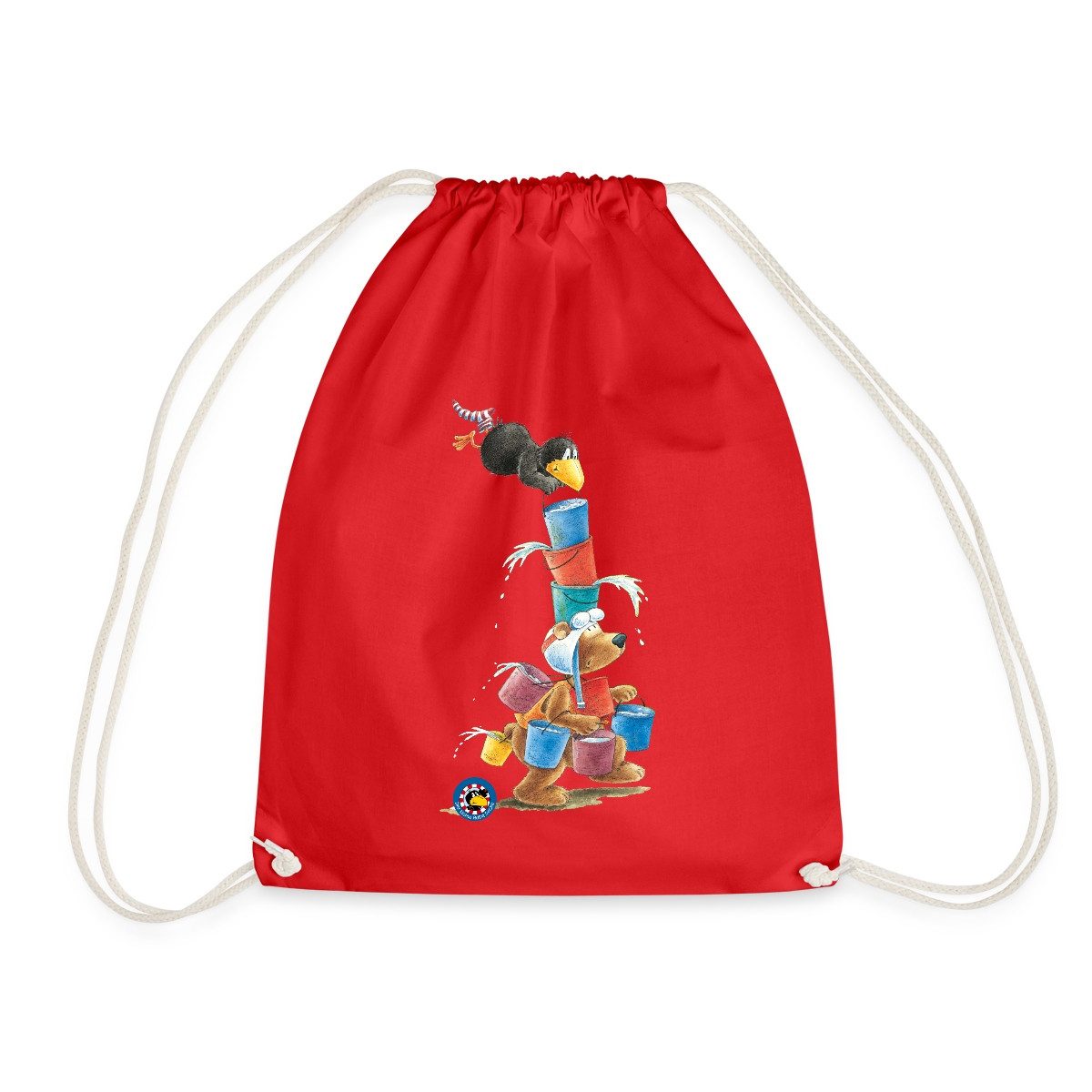 • Der Eddi-Bär und der kleine Rabe Socke versuchen ganz viele Wassereimer auf einmal zu tragen. Ein offizielles Lizenzprodukt aus der Der kleine Rabe Socke Kollektion..