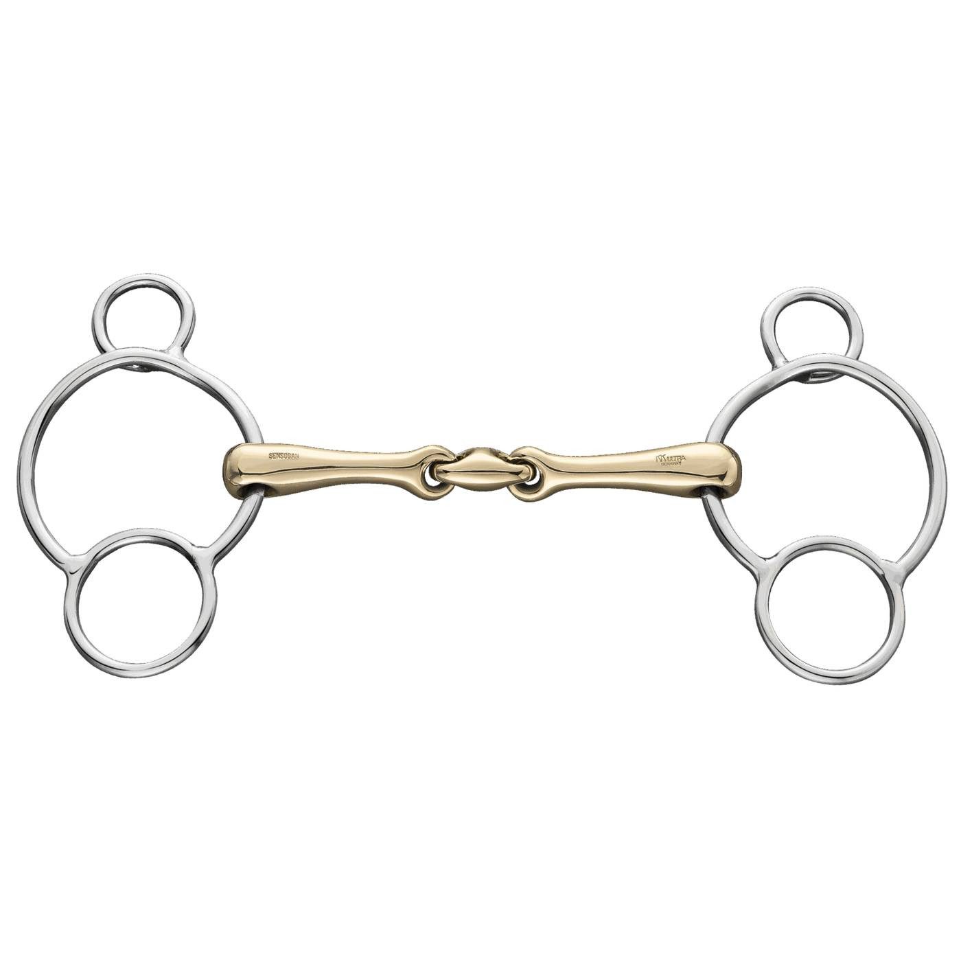 Kann wie die 3-Ring Trensen in verschiedener Weise ein geschnallt werden (siehe Abb.) und ist besonders vielseitig einsetzbar. Ist auch für sensiblere Pferde geeignet, da es etwas „weicher“ ist als das Modell 40607. Die Hebelwirkung auf das Genick setzt durch die oberen versetzten Ringe später ein. Beim Einsatz in der Vielseitigkeit wird bevorzugt mit dem ebenfalls erhältlichen Lederriemen geritten, der den Druck auf das Genick begrenzt und zusätzlich Druck auf den Unterkiefer ausübt. Doppelt gebrochene Gebisse, bei denen das olivenförmige Mittelstück – im Vergleich zu herkömmlichen Gebissen – gekürzt und in einem Winkel von 45° nach vorne geneigt ist. Nur bei dieser Winkelstellung liegt das Mittelstück besonders sanft auf der Zunge. Die Gebisse ermöglichen deshalb eine erheblich bessere Anlehnung und sehr feine Zügeleinwirkung.