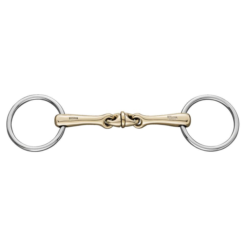 Die doppelt gebrochene Sprenger Sensogan WH-ULTRA Unterlegtrense verfügt über ein bewegliches Mittelstück, welches zum Kauen anregt und die Aufmerksamkeit des Pferdes steigert. Das Mundstück besteht aus Sensogan. Die Olive (Mittelstück) ist um 45 Grad gedreht und gewährleistet eine sanfte jedoch sehr effektive Kommunikation mit dem Pferd. Gleichzeitig wurde ein bewegliches Teil in das Mittelstück eingebaut, welches die Konzentration des Pferdes noch besser auf die Zunge lenkt, wodurch das Pfe rd empfänglicher für die Zügelhilfen wird.