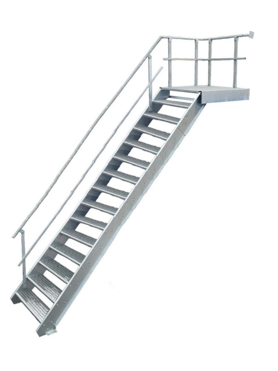 -Stahltreppe verzinkt mit Geländer links und 14 Stufen + Podest + Stützen / Geschosshöhe 250-320cm / Stufenmaße 100 cm x 24 cm / Podest-Außenmaß ca. 107,5 cm x 113,5cm