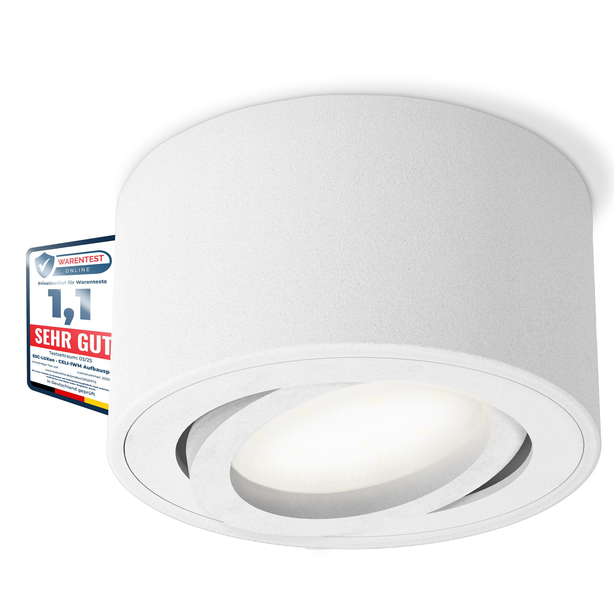 Wo aus baulichen Gründen Einbauleuchten nicht möglich sind, kommt dieser kleine Aufbaustrahler zum Einsatz. Dank der geringen Höhe (nur 50 mm) und dem mitgelieferten LED Leuchtmittel ergibt dieser Strahler eine perfekte Kombination zur Deckenbeleuchtung in Ihrem Büro, Schlafzimmer oder Flur. Der weiße Innenring der Aufbaulampe lässt sich um ca. 30° schwenken. Somit können Sie den neutralweißen Lichtkegel nach Ihren Wünschen ausrichten.