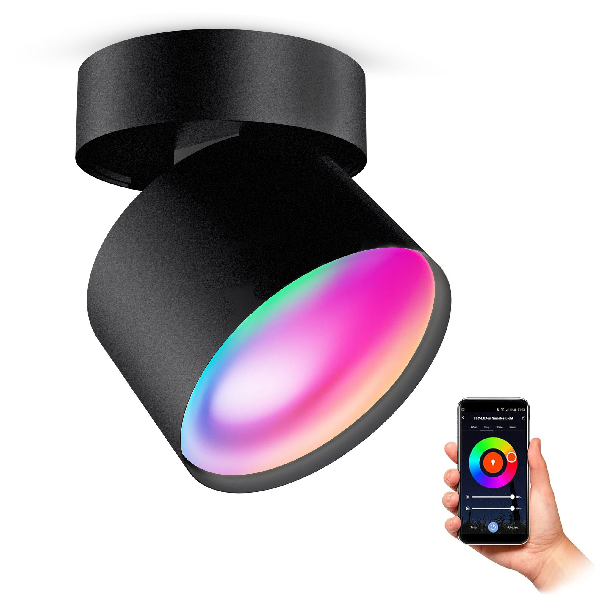 Der schwarze Aufbauspot ist nicht nur ein Blickfang, sondern bietet durch das mitgelieferte GX53 Leuchtmittel mit modernste Smart Home Technik eine Vielzahl an Funktionen. Verändern Sie die Farbtemperatur oder RGB Lichtfarbe der Strahler Lampe einfach per App bzw. Sprache oder dimmen Sie das Licht nach Ihren Wünschen. Dank der Gruppenfunktion lassen sich auch mehrere Aufputz Spot Lampen gleichzeitig steuern. Dies ist besonders praktisch, wenn Sie mehrere Deckenlampen als Hauptlichtquelle installieren wollen.