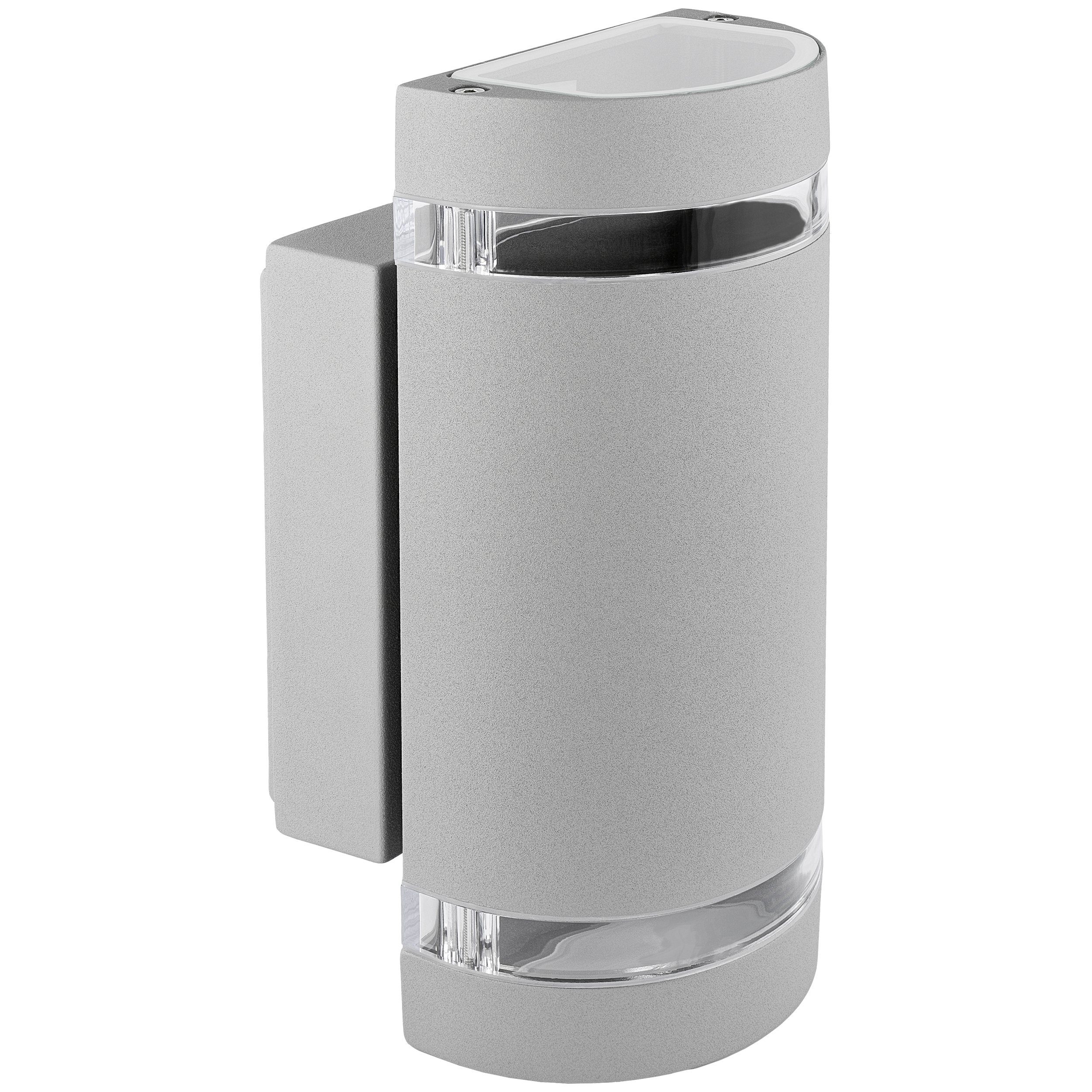 Lieferumfang | 1x Außen-Wandleuchte grau mit Glaseinsatz, IP44-2x LED-Lampe 4W warmweiß, GU10 Sockel, 110° Abstrahlwinkel- |