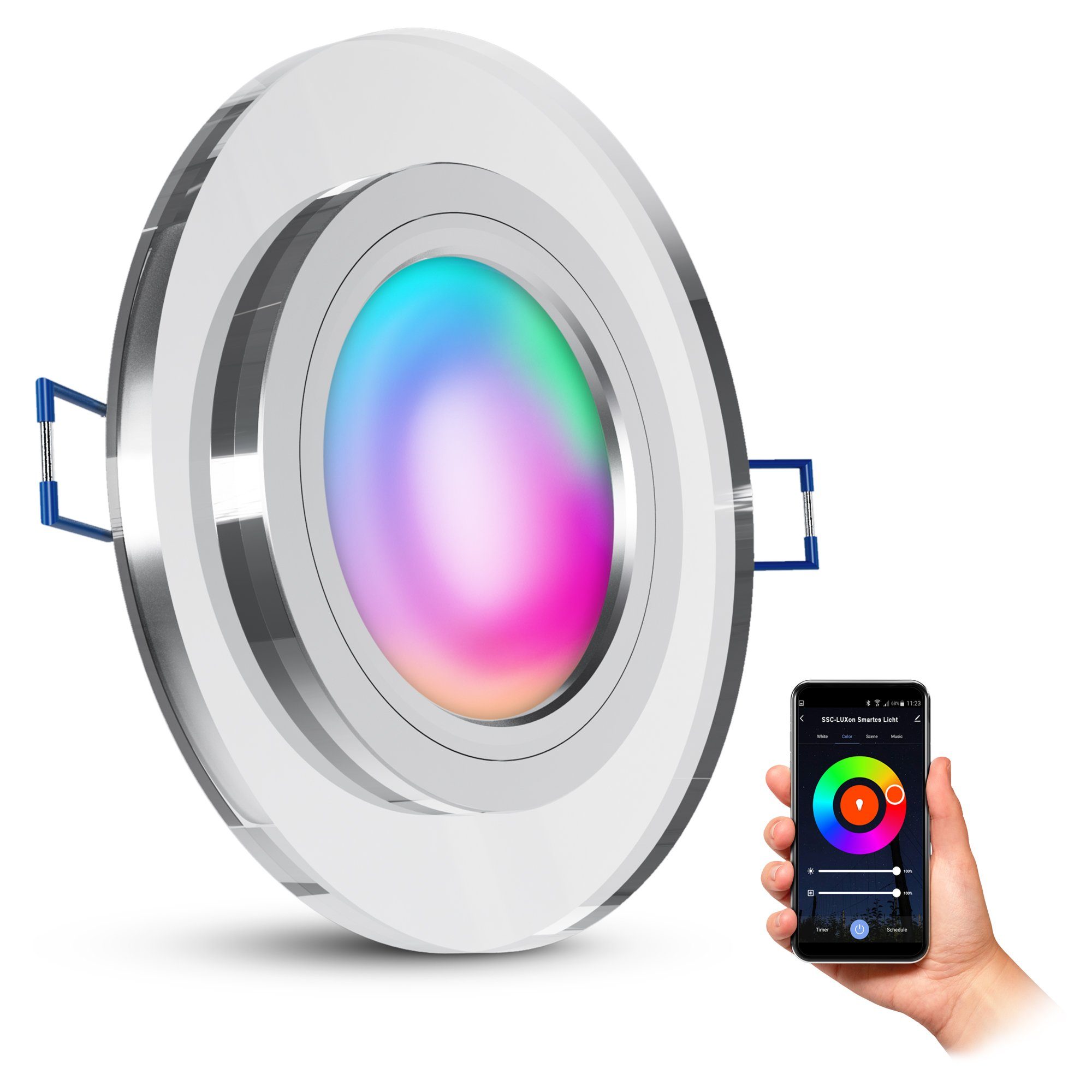 Lieferumfang | 1x Glas Einbaustrahler Rahmen-1x Smart RGB LED Modul- |