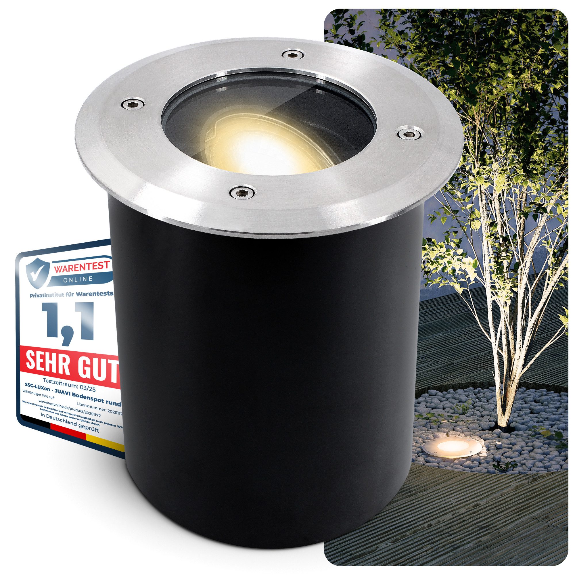 Lieferumfang | 1x Bodenleuchte JUAVI rund mit silberner Front-1x GU10 LED Leuchtmittel warmweiß-2x Glasscheiben (klar & milchig) |