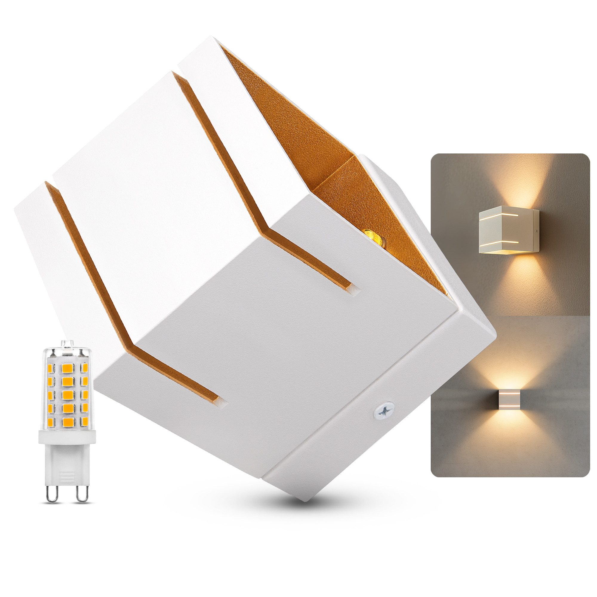 Lieferumfang | 1x Wandstrahler KOURA DUO mit Lichteffekten schwarz gold eckig-1x G9 Leuchtmittel 3W warmweiß dimmbar- |