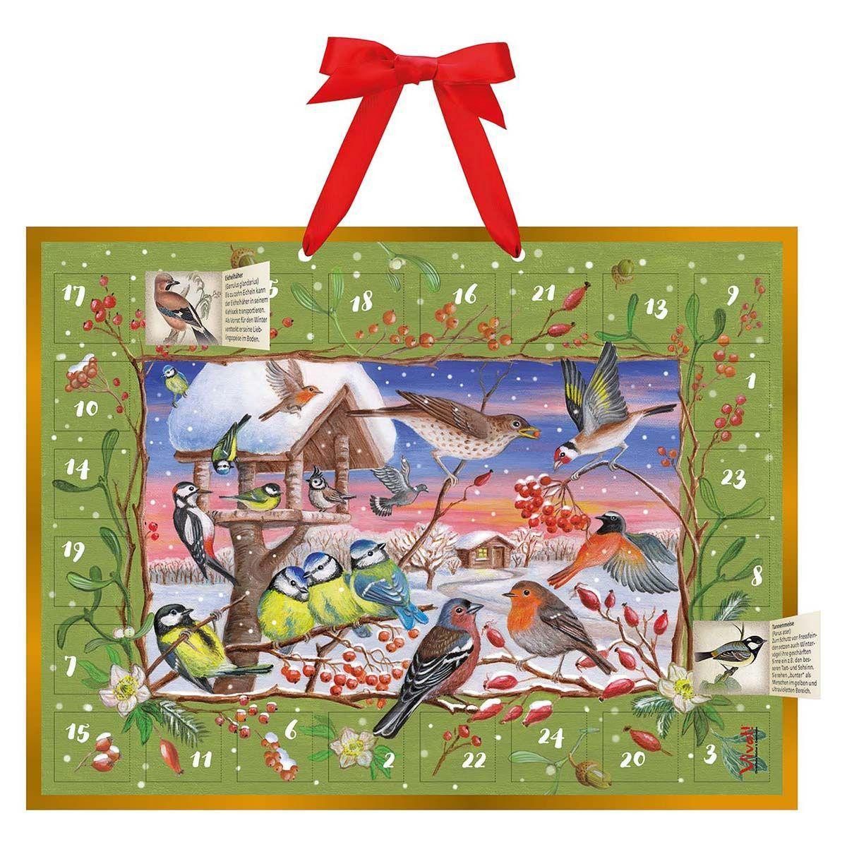 Der Winter ist eine ideale Zeit, um Vögel zu beobachten, denn während sie sich zu den übrigen Jahreszeiten gerne in Bäumen und Büschen verstecken, trauen sie sich, wenn es kalt wird, ganz offen ans Futterhaus. Dieser Adventskalender vereint 24 der beliebtesten heimischen Vogelarten, darunter die Blaumeise, der Zaunkönig, der Eichelhäher und der Kernbeißer. Wunderbar im nostalgischen Stil von der Künstlerin Charis Werner gestaltet, tummeln sich einige dieser Vögel in einer zauberhaften Winterkulisse. Hinter den einzelnen Adventskalendertürchen findet man nicht nur kurze spannende Informationen über die jeweiligen Vögel, sondern auch dazugehörige schöne Sticker zum Verzieren und Schmücken. (Pappe, 40 x 30 cm, 24 verschiedene Sticker, je ca. 3,5 × 3,5 cm, mit Band zum Aufhängen, Длина 60 cm)